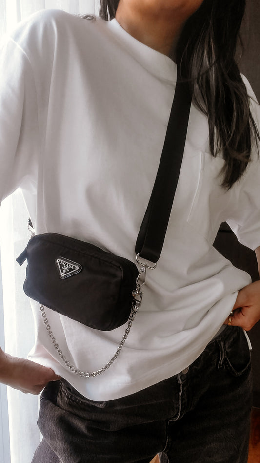 Authentic Prada Upcycle Versatile Black Nylon Small Pouch with Chain & Strap