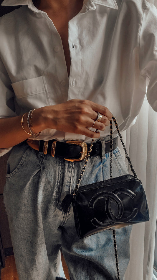 Authentic Vintage Chanel Upcycle Black Patent Pouch with Chain