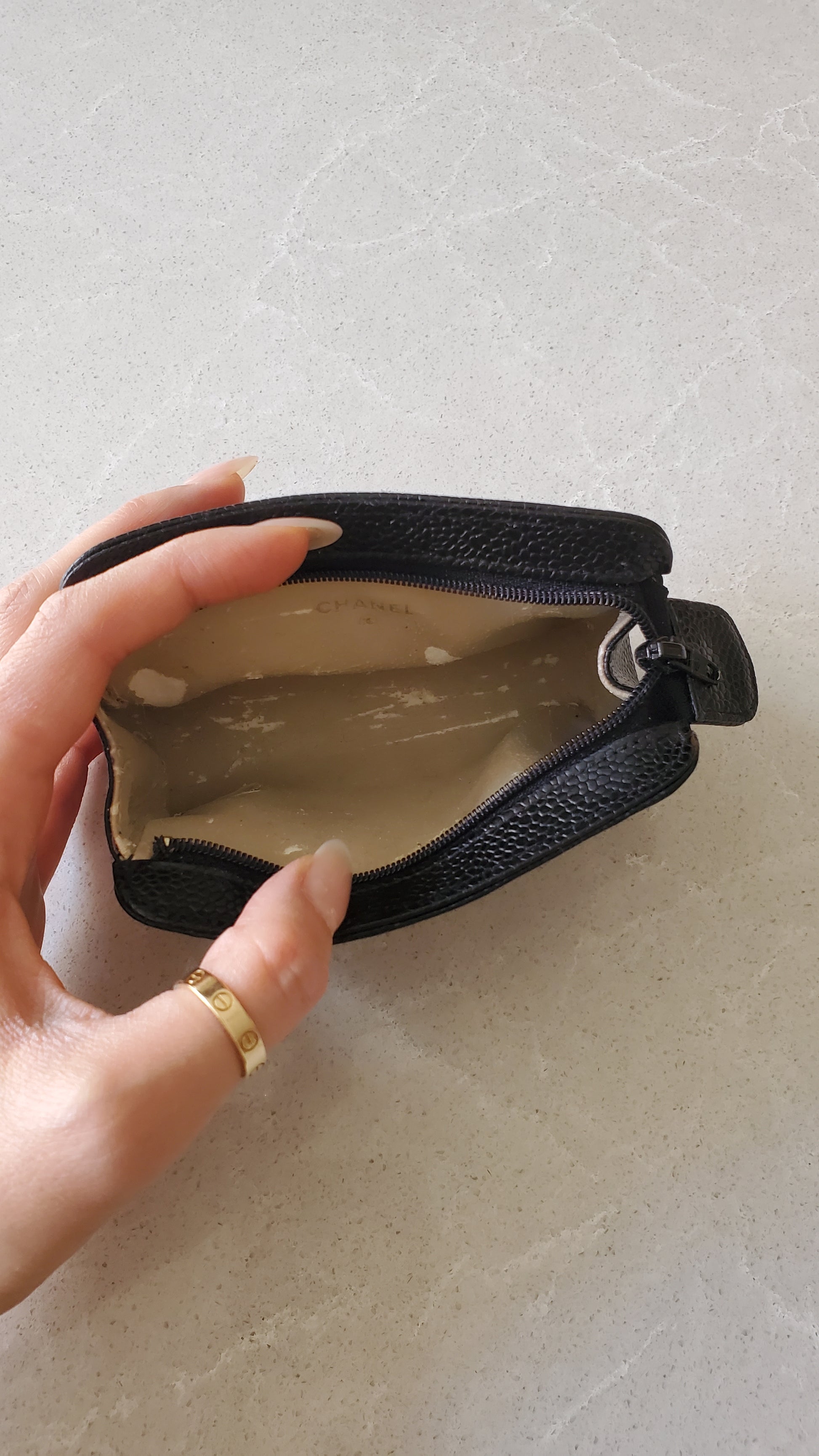 Beautiful authentic Chanel black caviar leather pouch from, outer leather is in great vintage condition overall; inside will need to be cleaned, removed/ replaced priot to use *see all photos for condition*