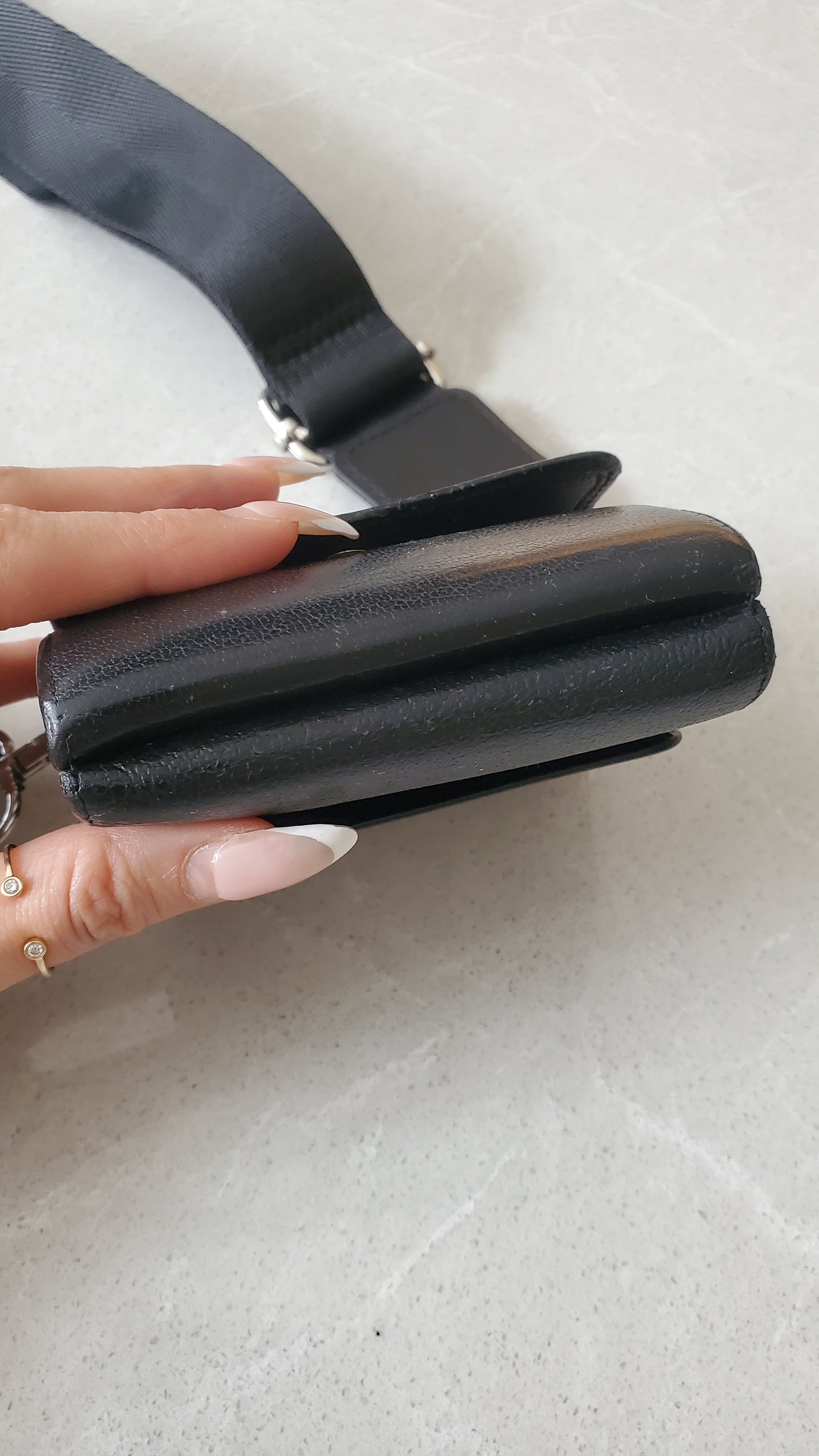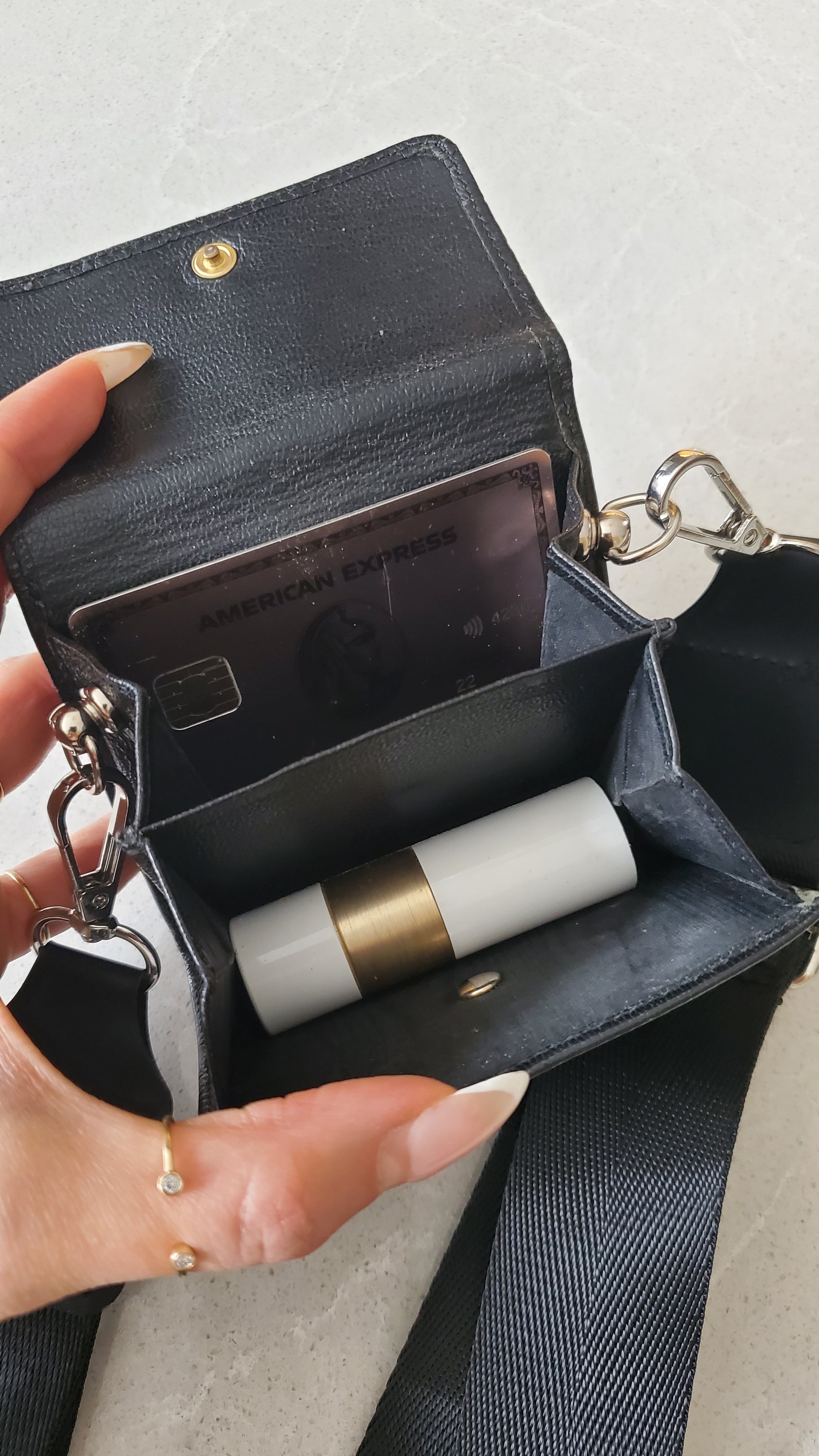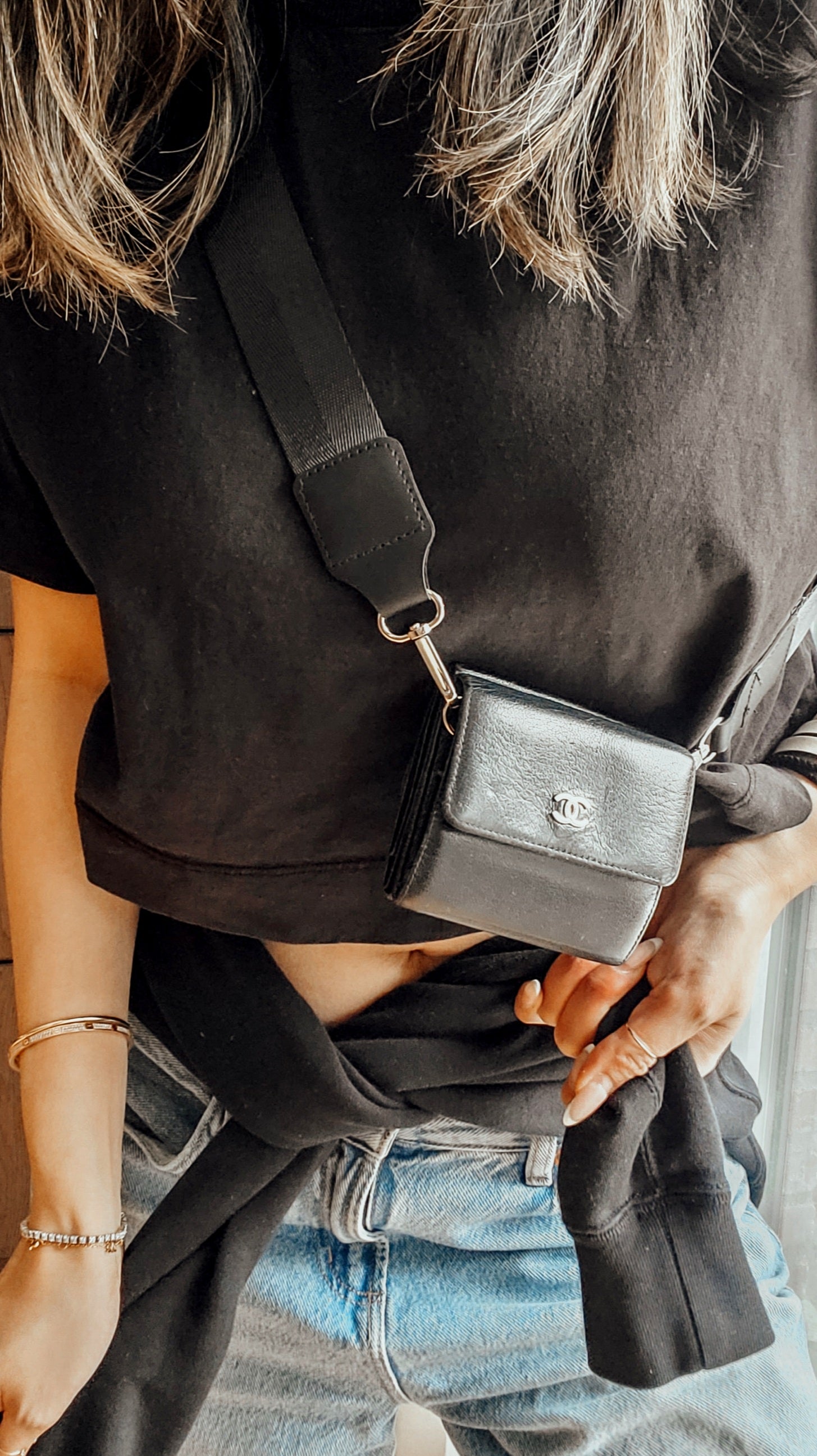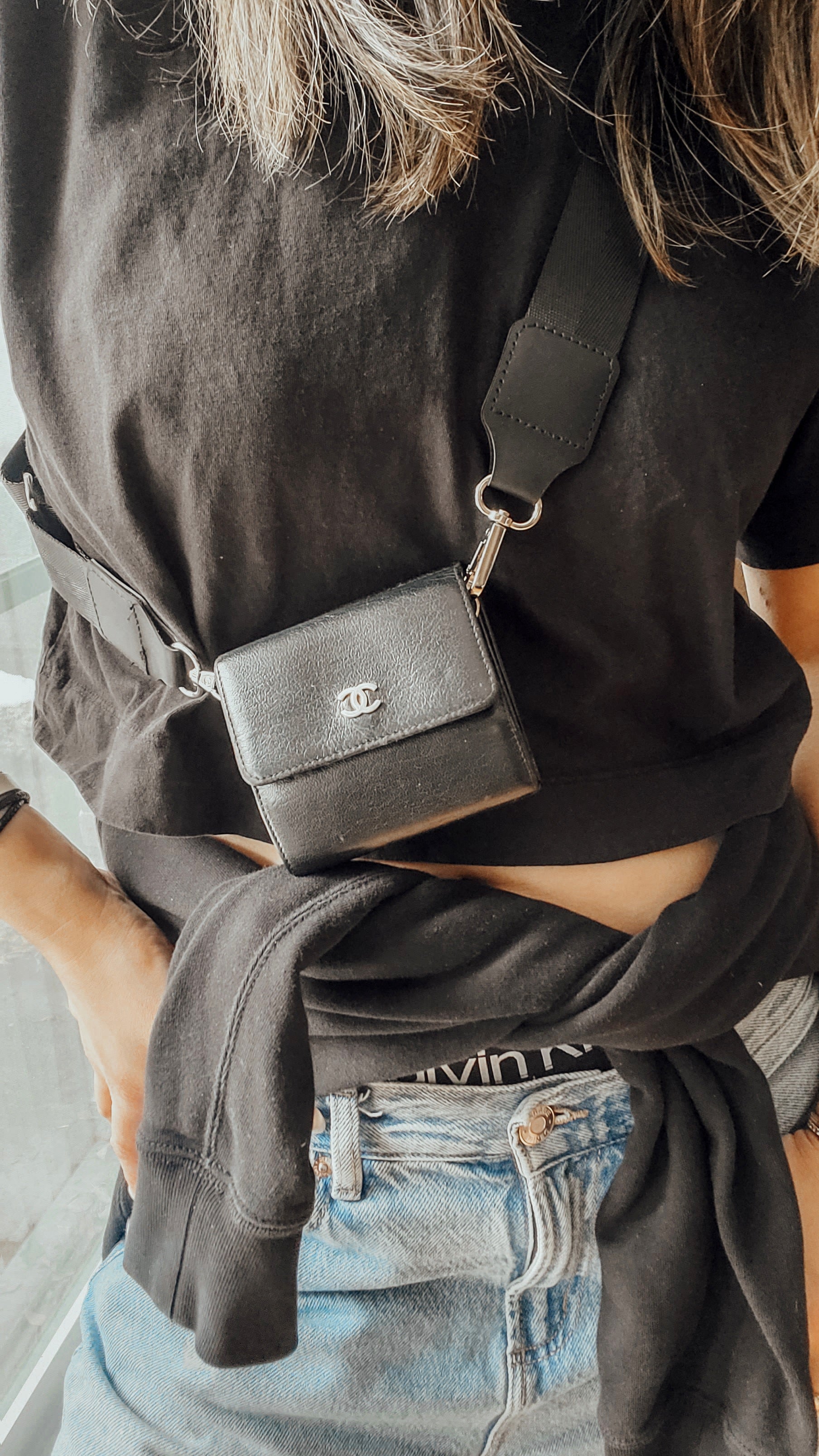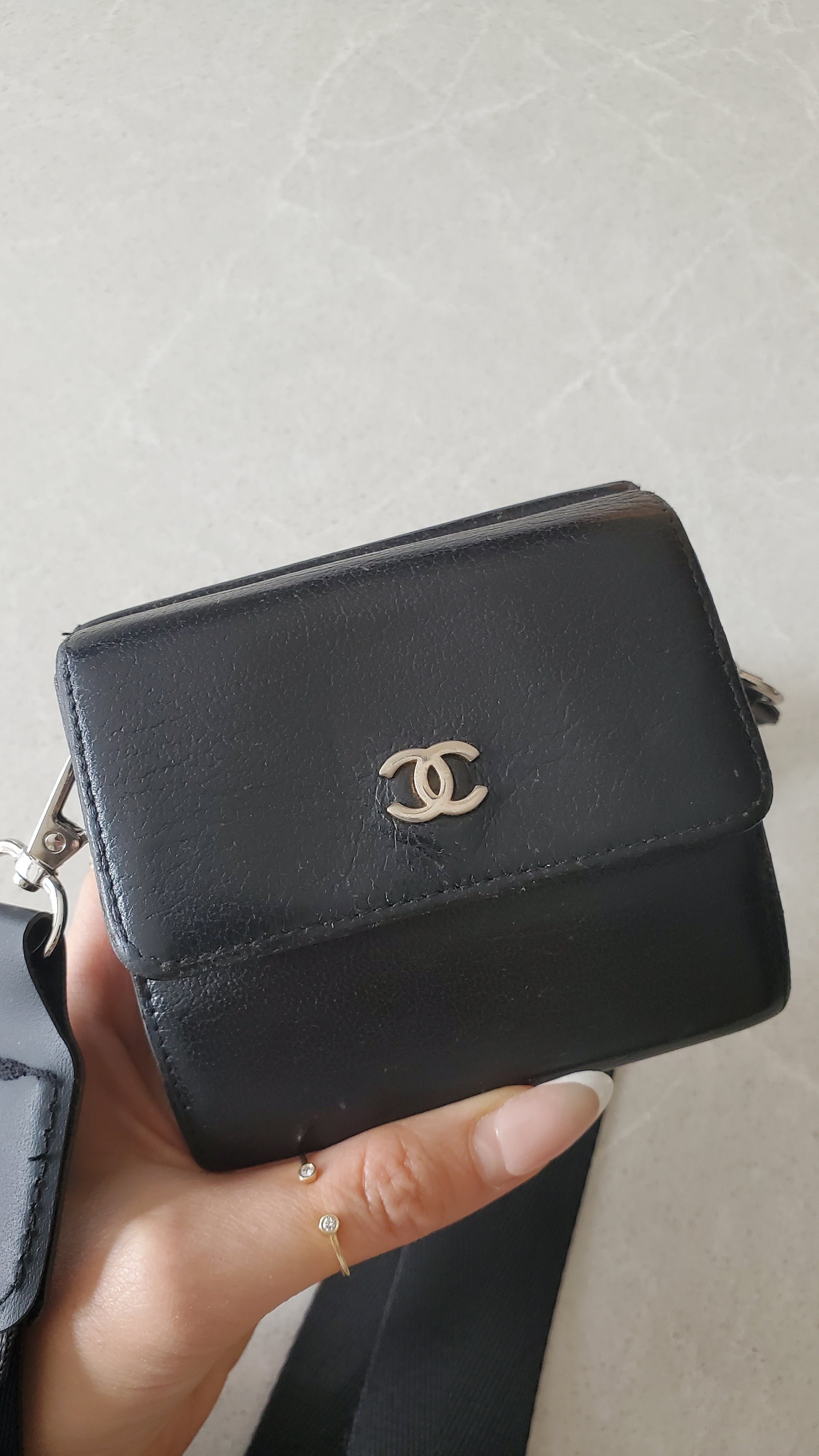 Authentic Chanel black caviar compact wallet reworked into a modern and versatile piece with strap that can be worn crossbody, or on the shoulder! See photos for styling ideas