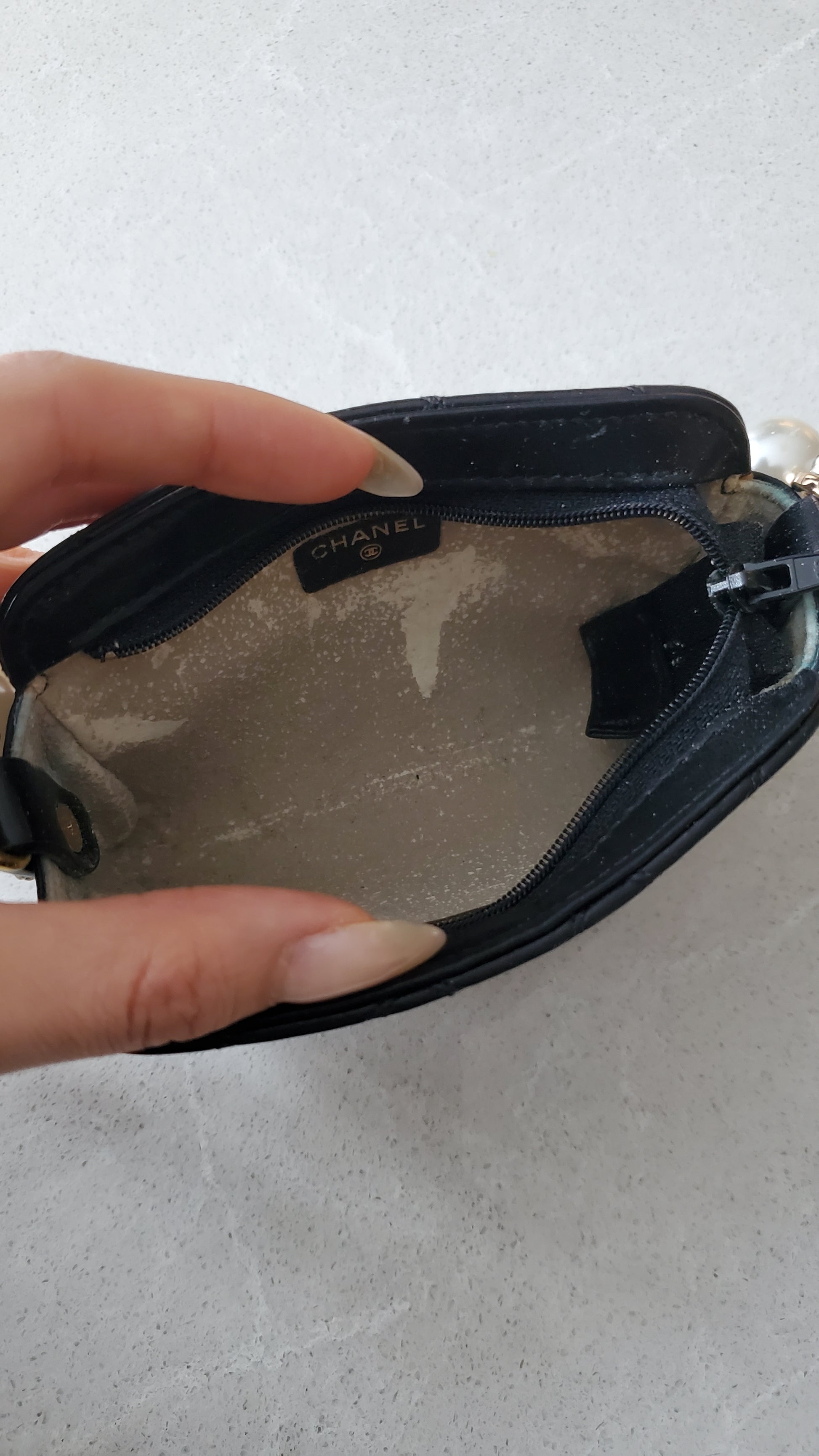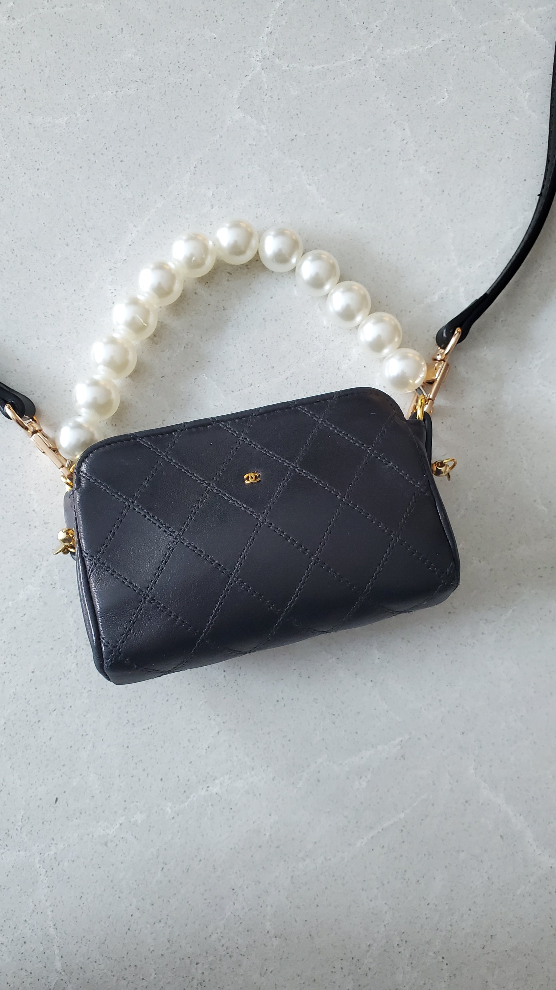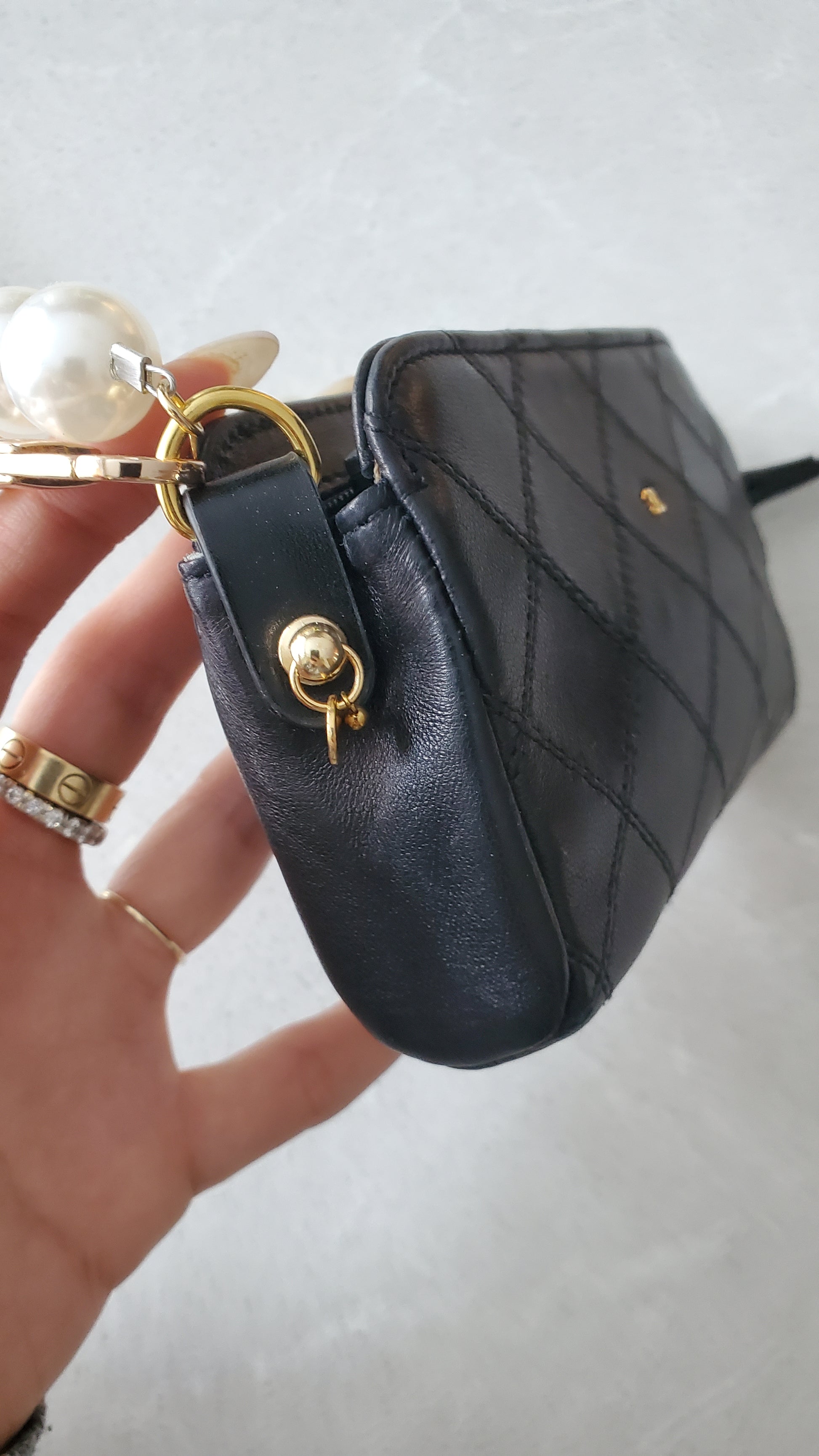 Authentic Chanel black lambskin leather small pouch reworked into a modern and versatile pouch with strap, and handmade faux pearl chain that can be worn crossbody, on the shoulder, or handle! See photos for styling ideas