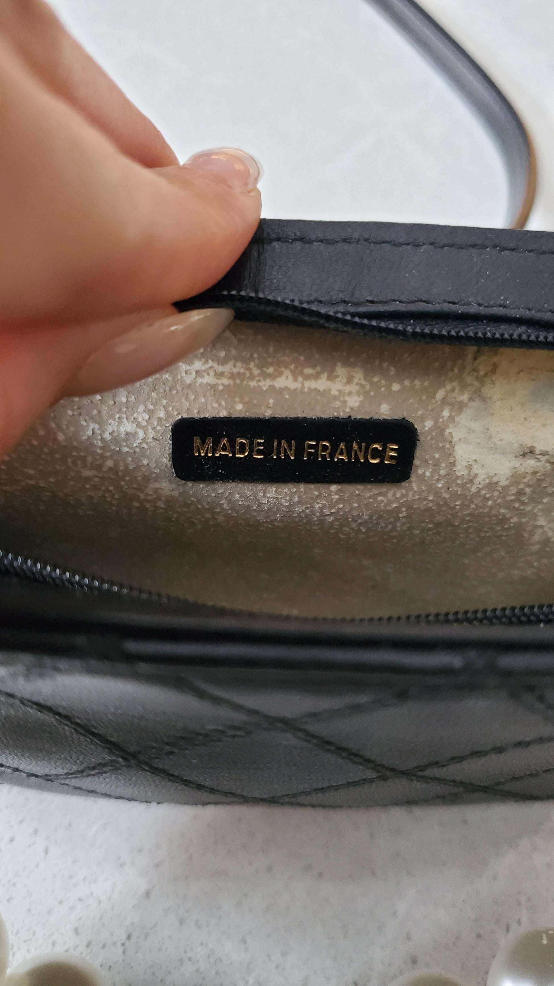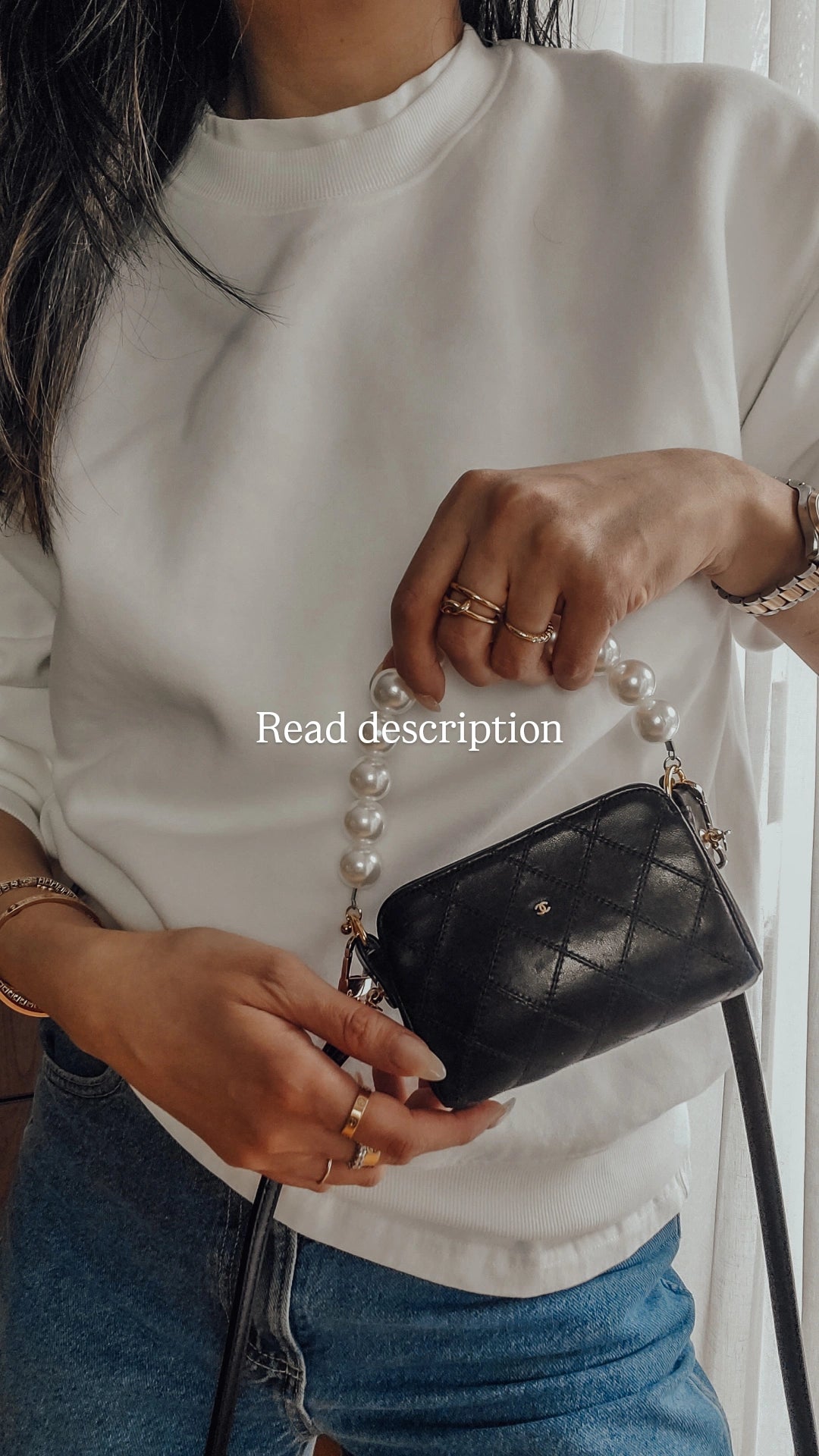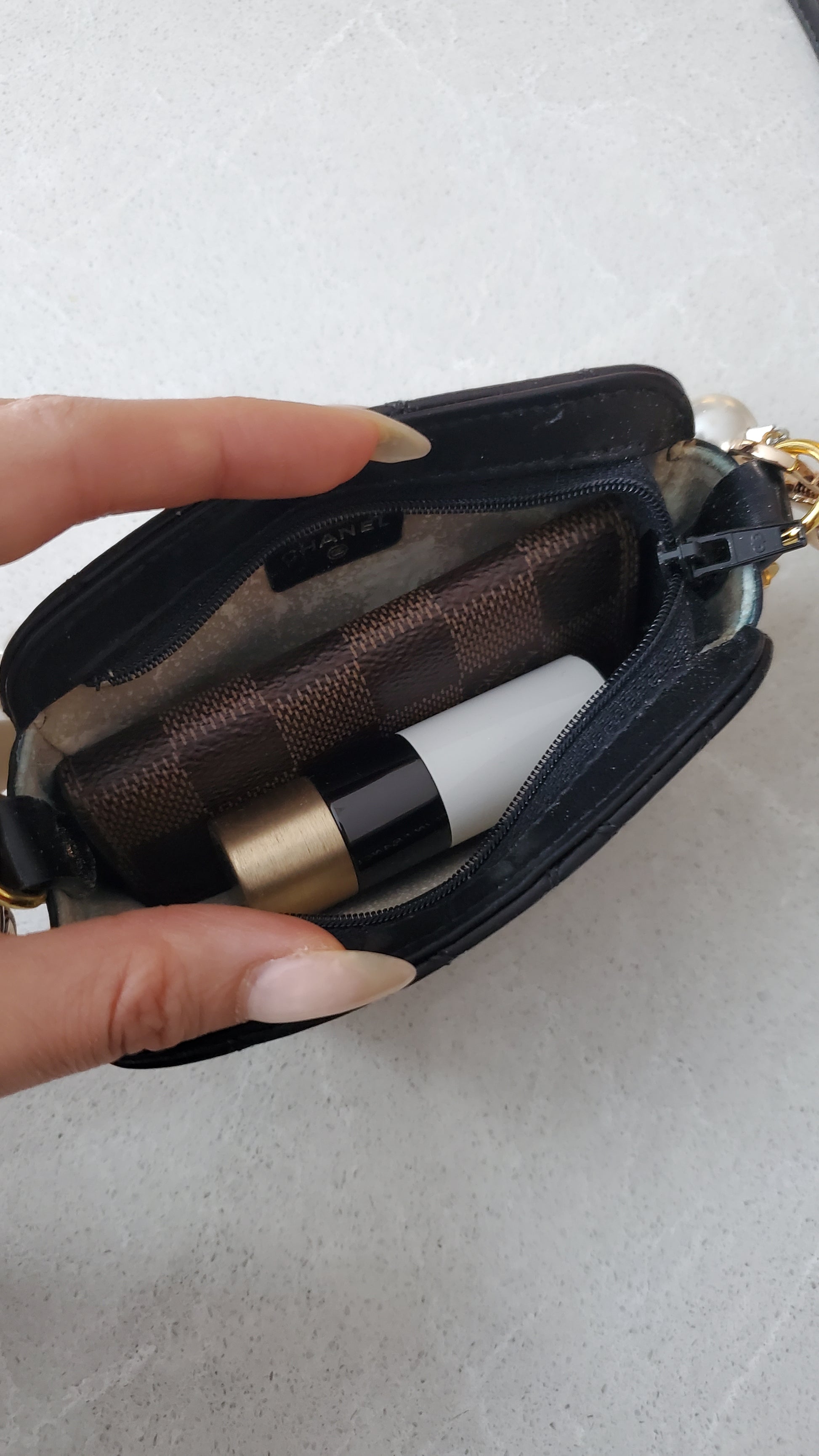 Authentic Chanel black lambskin leather small pouch reworked into a modern and versatile pouch with strap, and handmade faux pearl chain that can be worn crossbody, on the shoulder, or handle! See photos for styling ideas