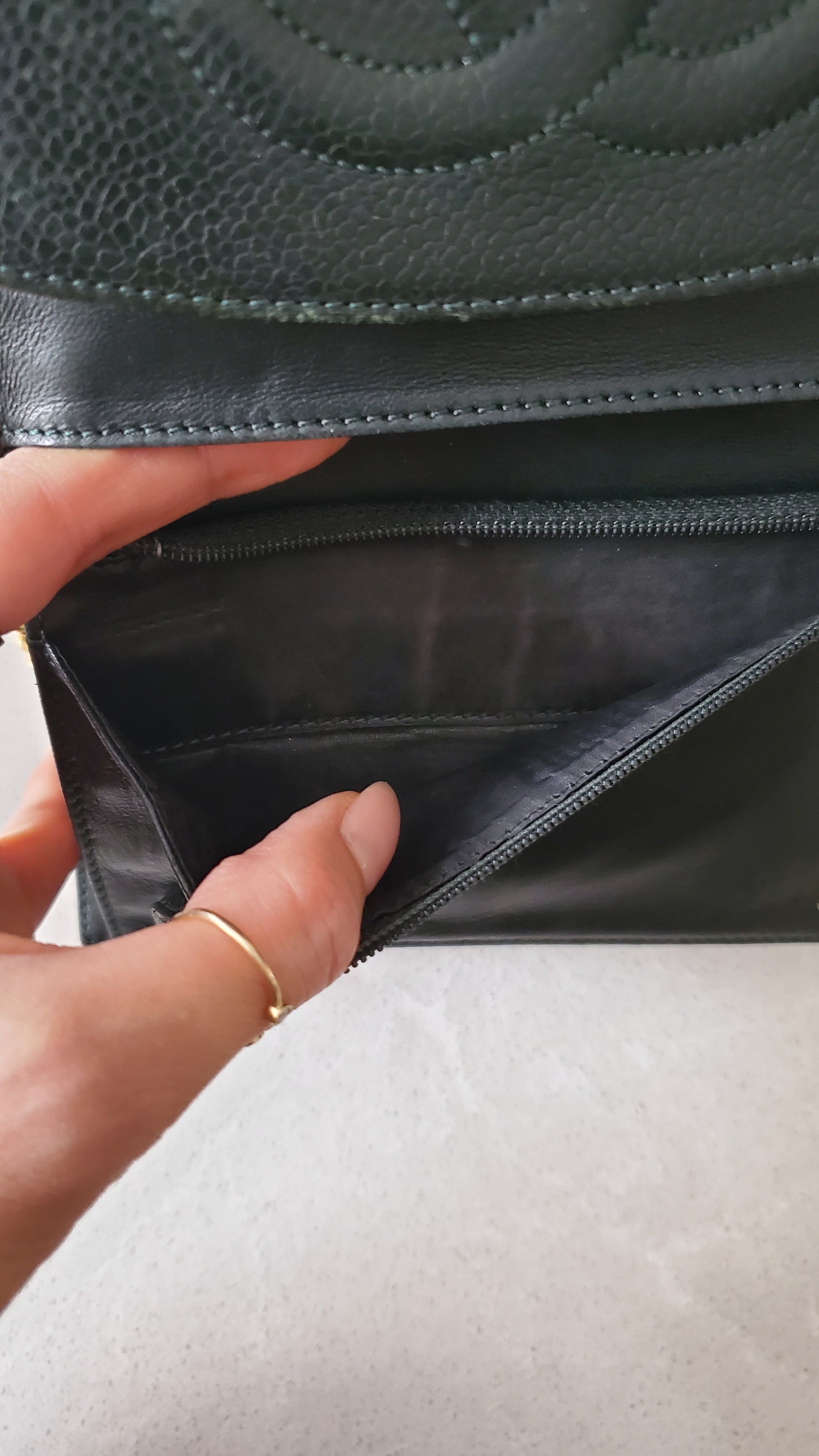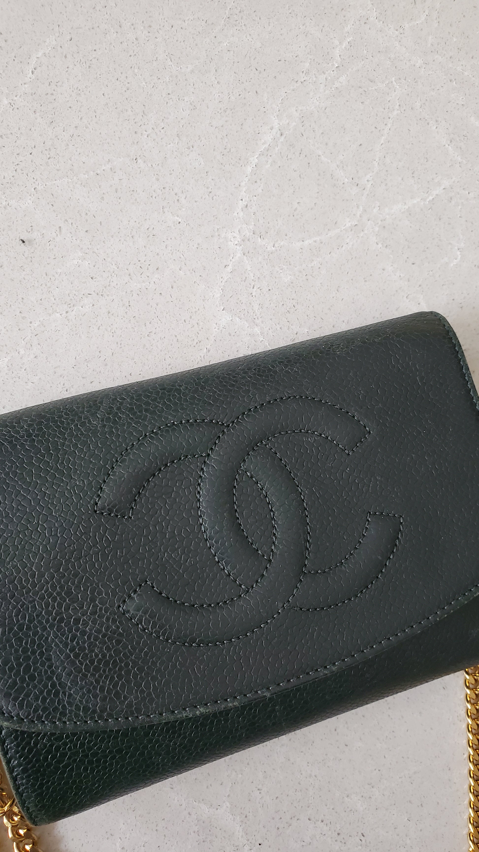 Beautiful authentic Chanel green caviar wallet reworked into a timeless and practical wallet on chain that can be worn crossbody, on the shoulder, or handle! See photos for styling ideas. Chain is adjustable from shoulder to crossbody, and vice versa
