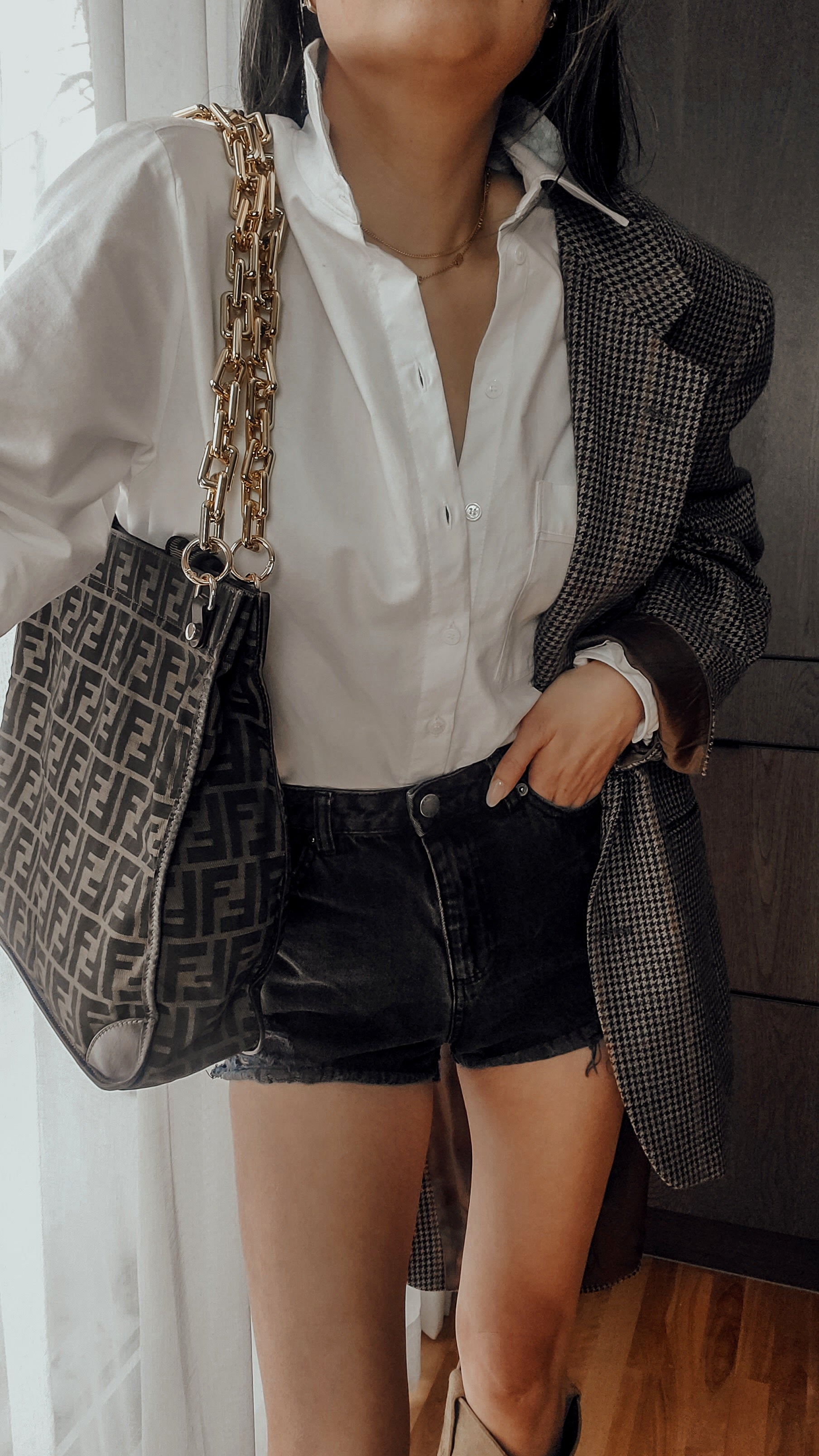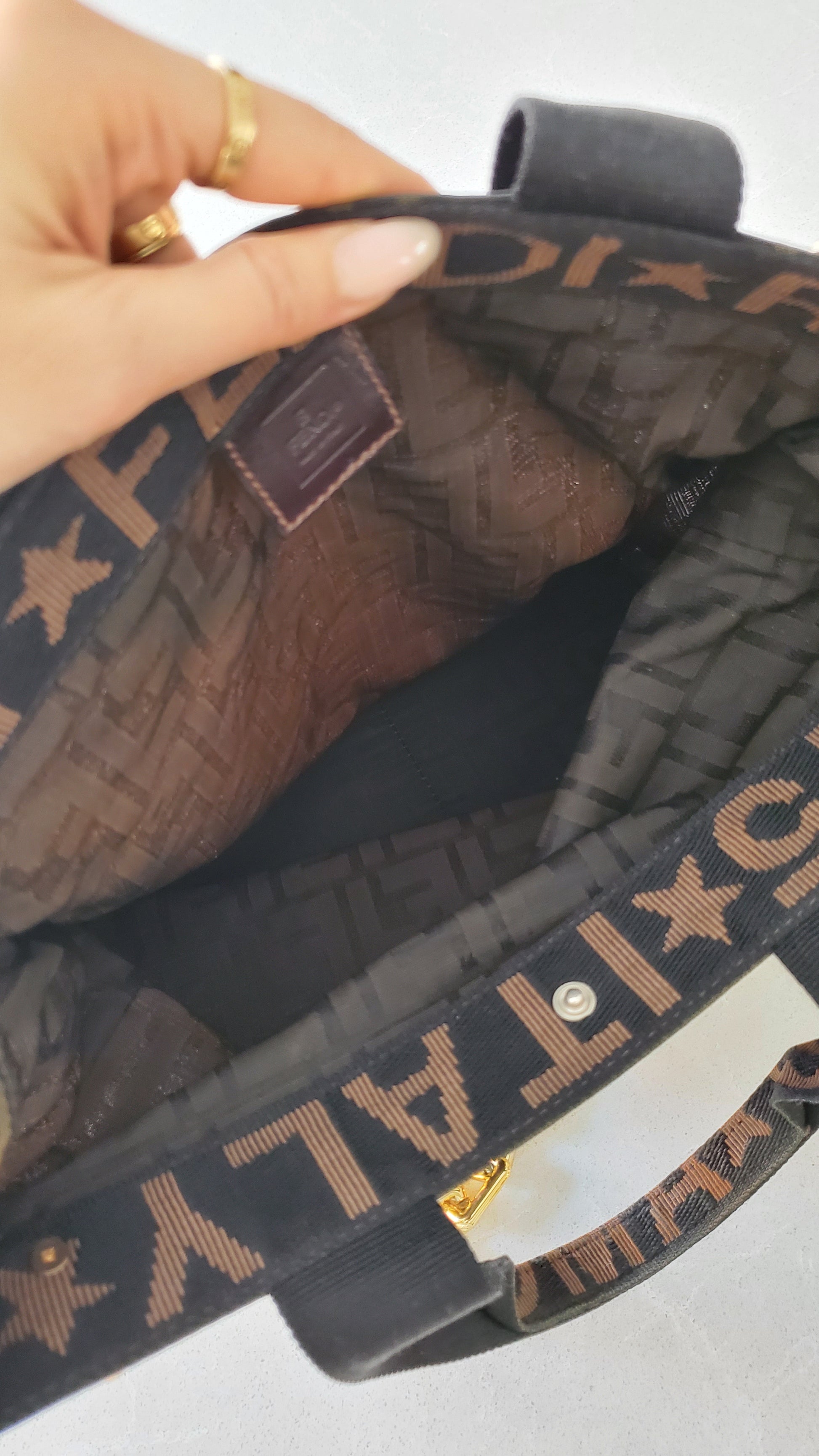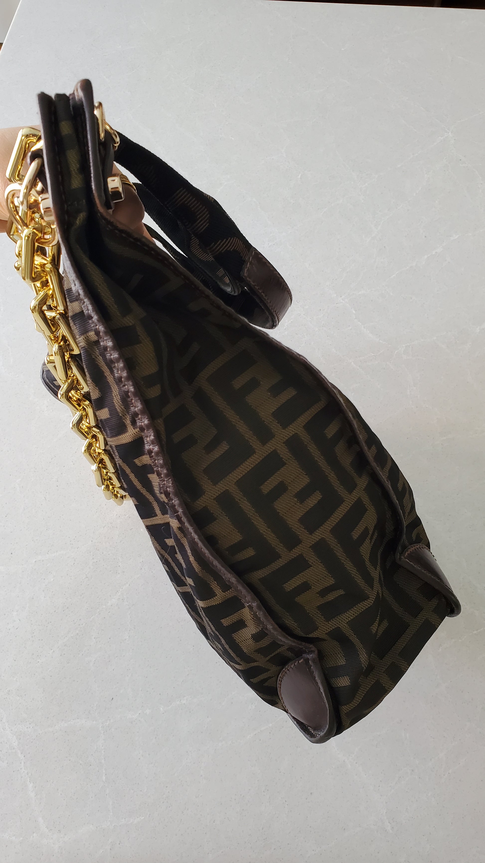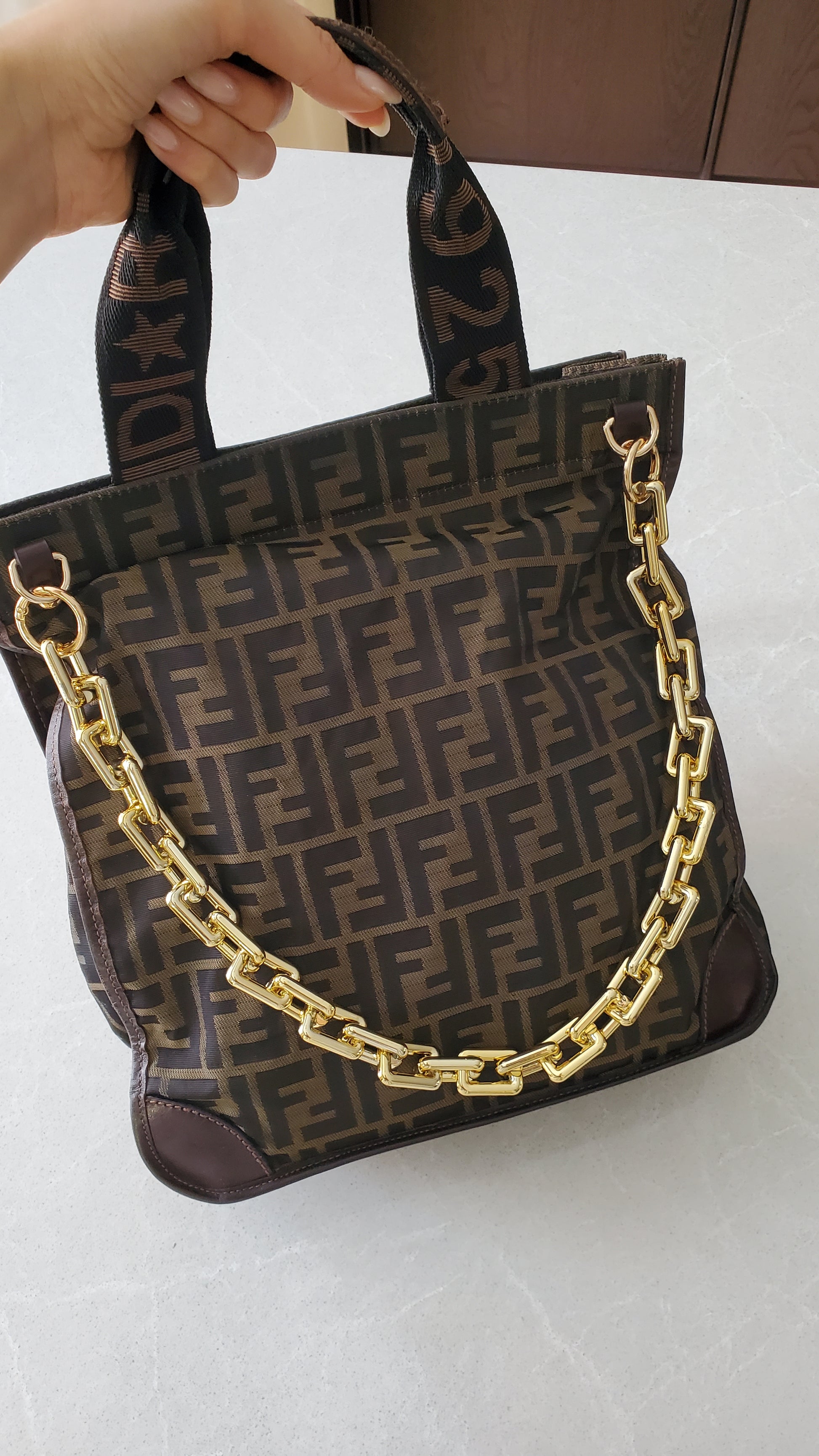 Authentic Fendi FF fabric canvas large tote bag redesigned with a brand new modern chains, and remade functional to wear it on the shoulder! See photos for styling ideas