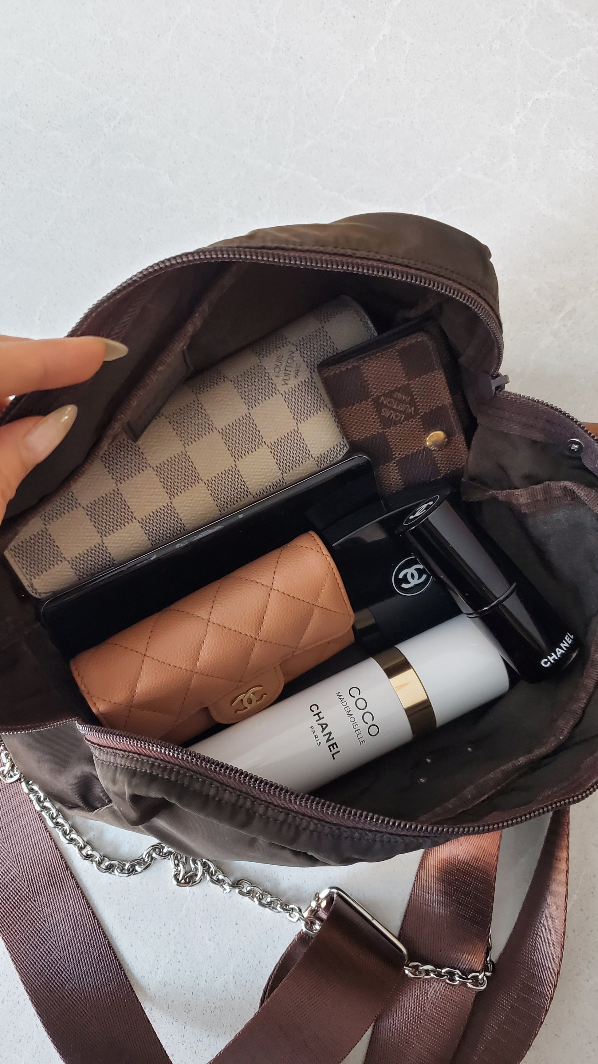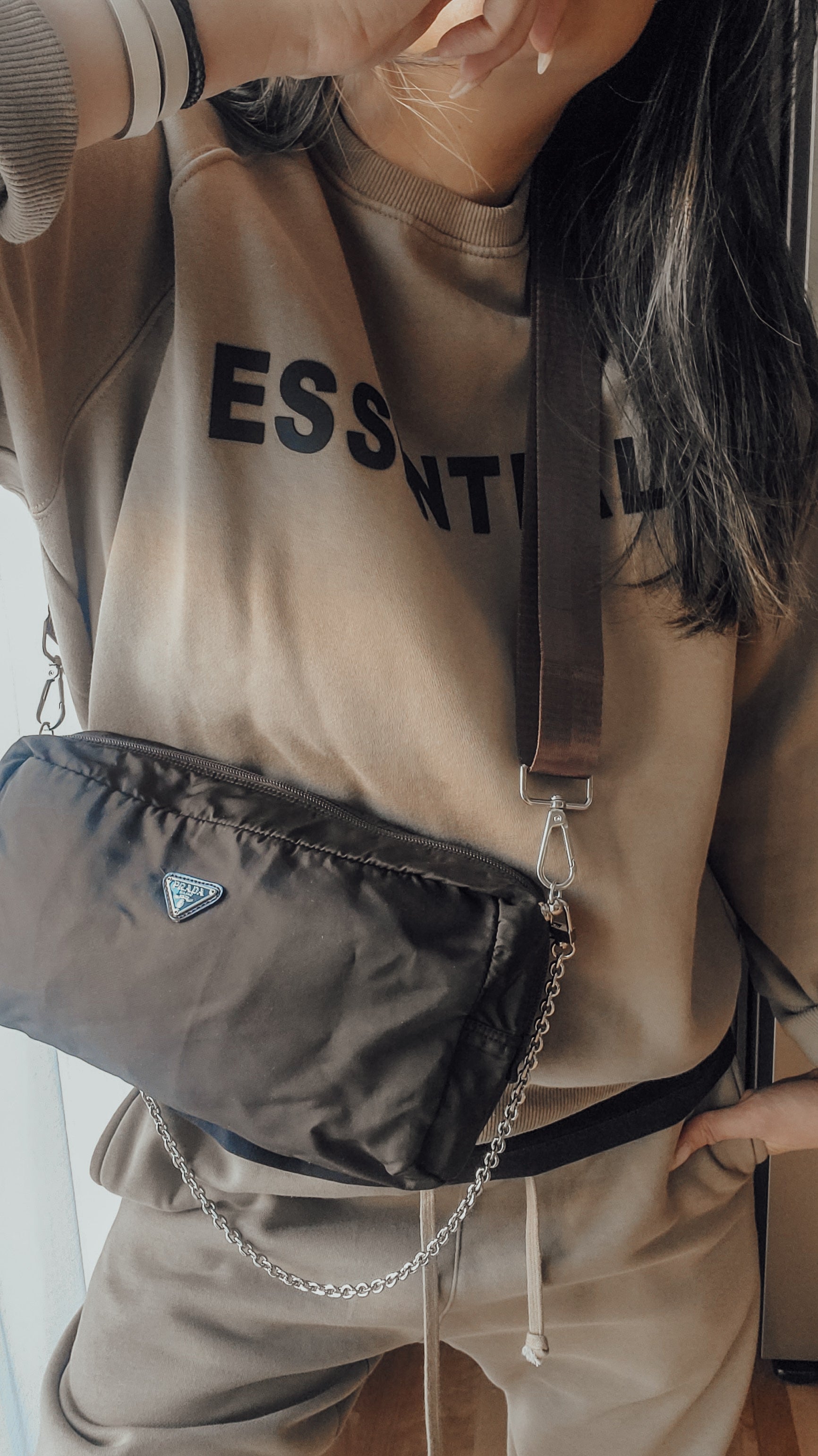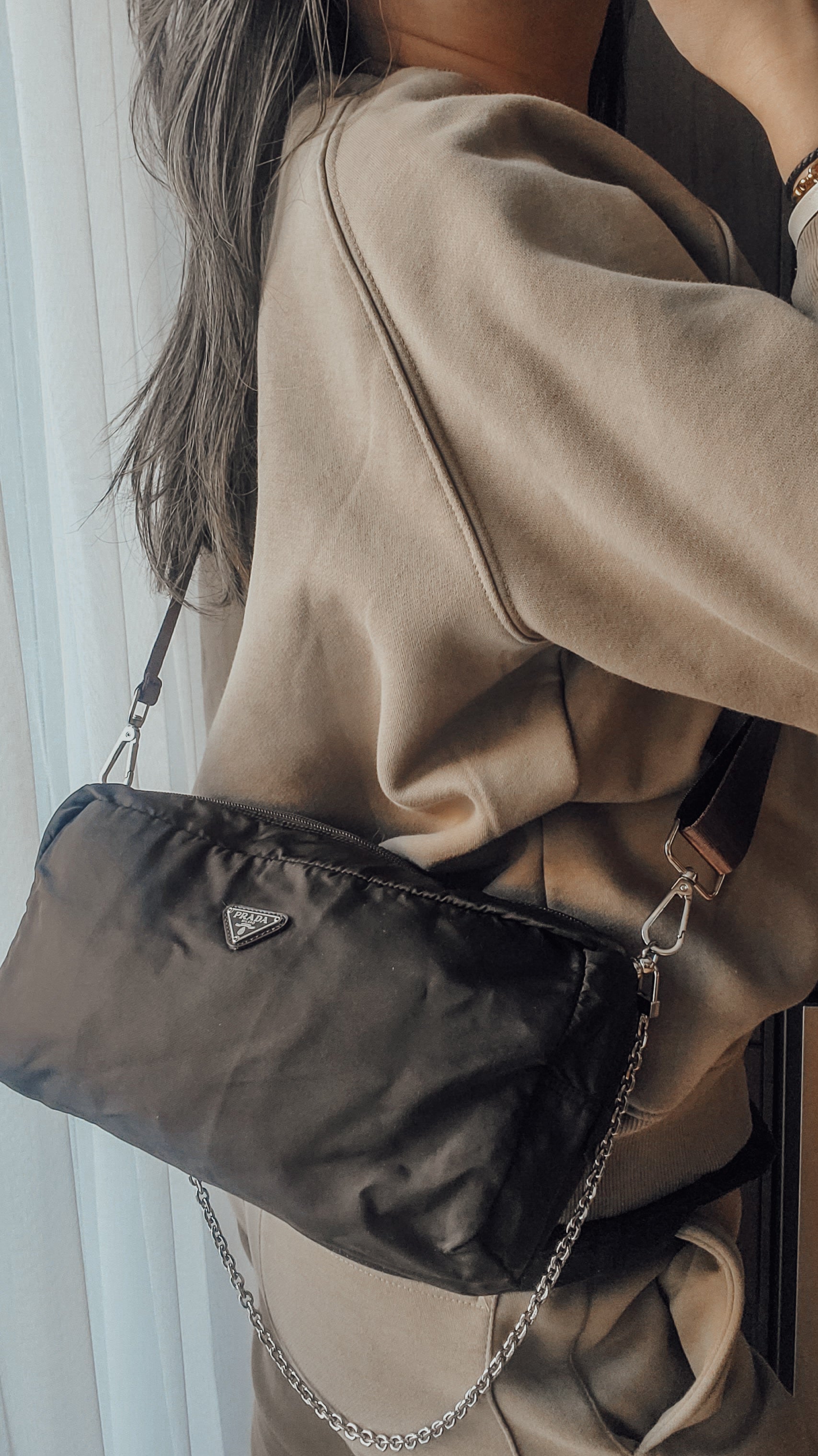 Authentic Prada dark green/ brown large nylon pouch reworked into a modern and versatile pouch with chain and strap that can be worn crossbody, shoulder, or handle! See photos for styling ideas