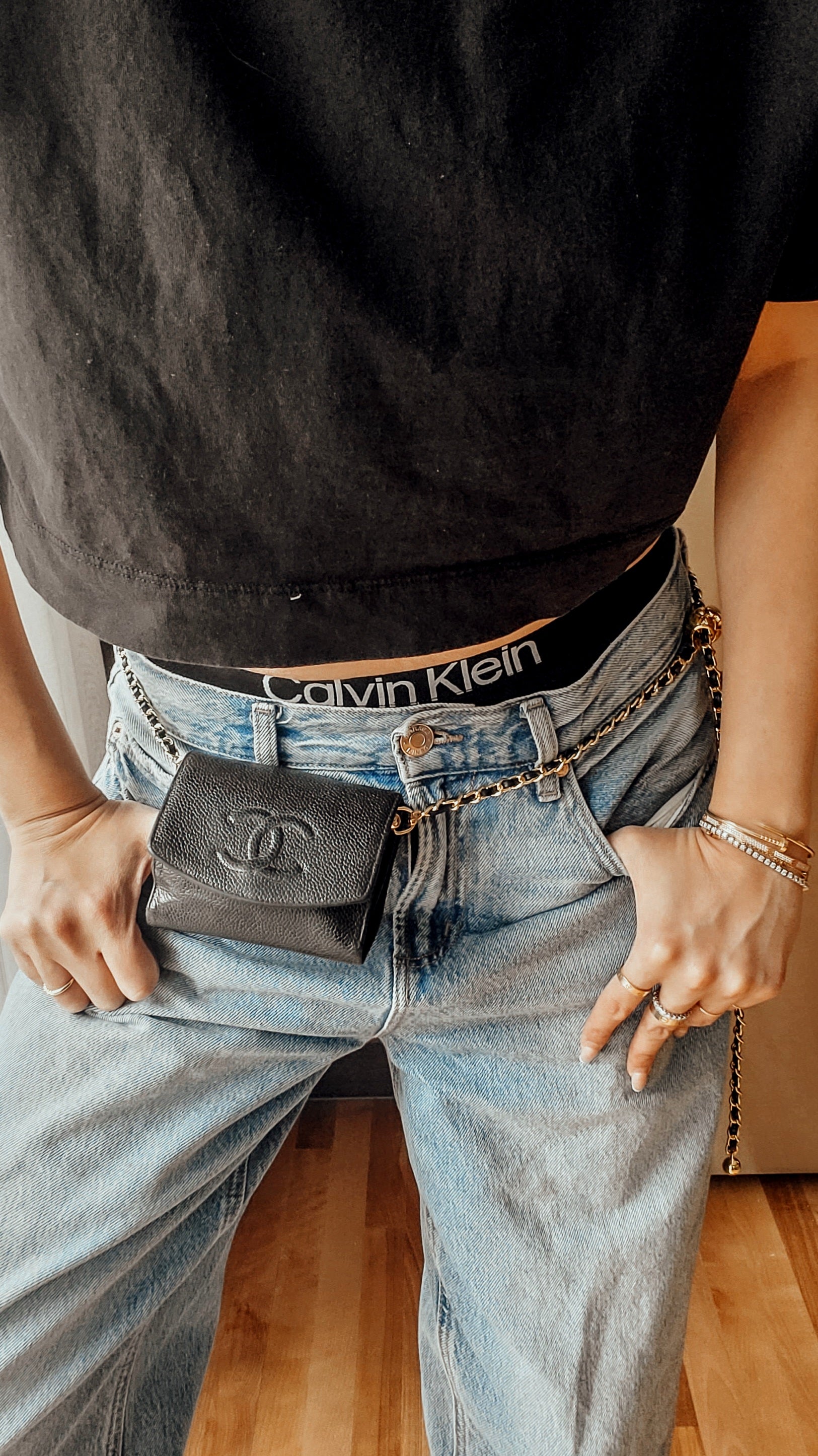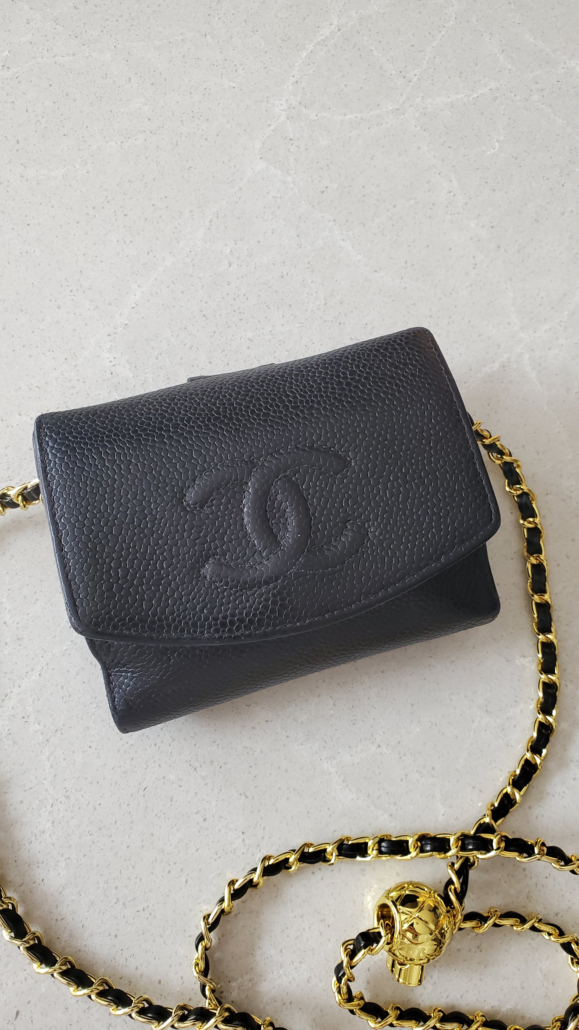 Authentic Chanel black caviar compact wallet, in good vintage condition overall (serial sticker # has been damaged during cleaning *see photos for condition*) reworked into a modern and versatile piece on chain that can be worn crossbody, shoulder, handle, or around the waist! See photos for styling ideas