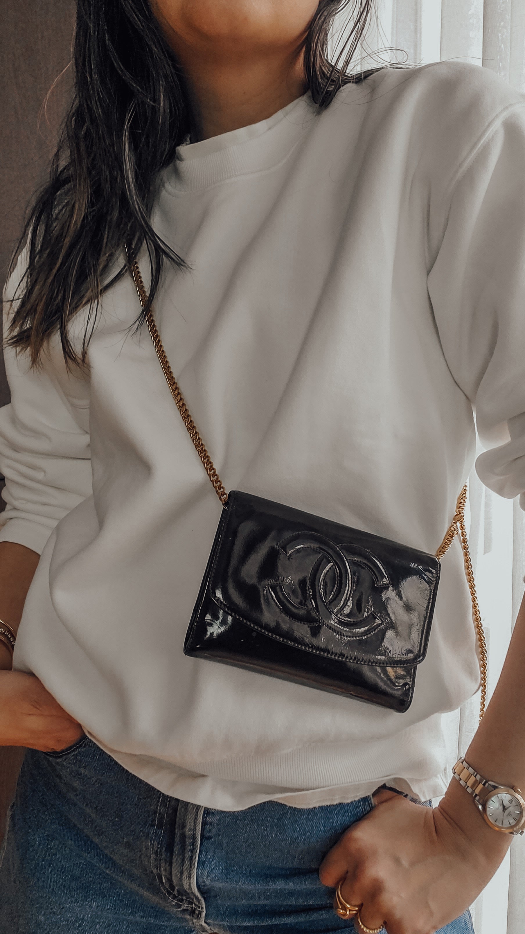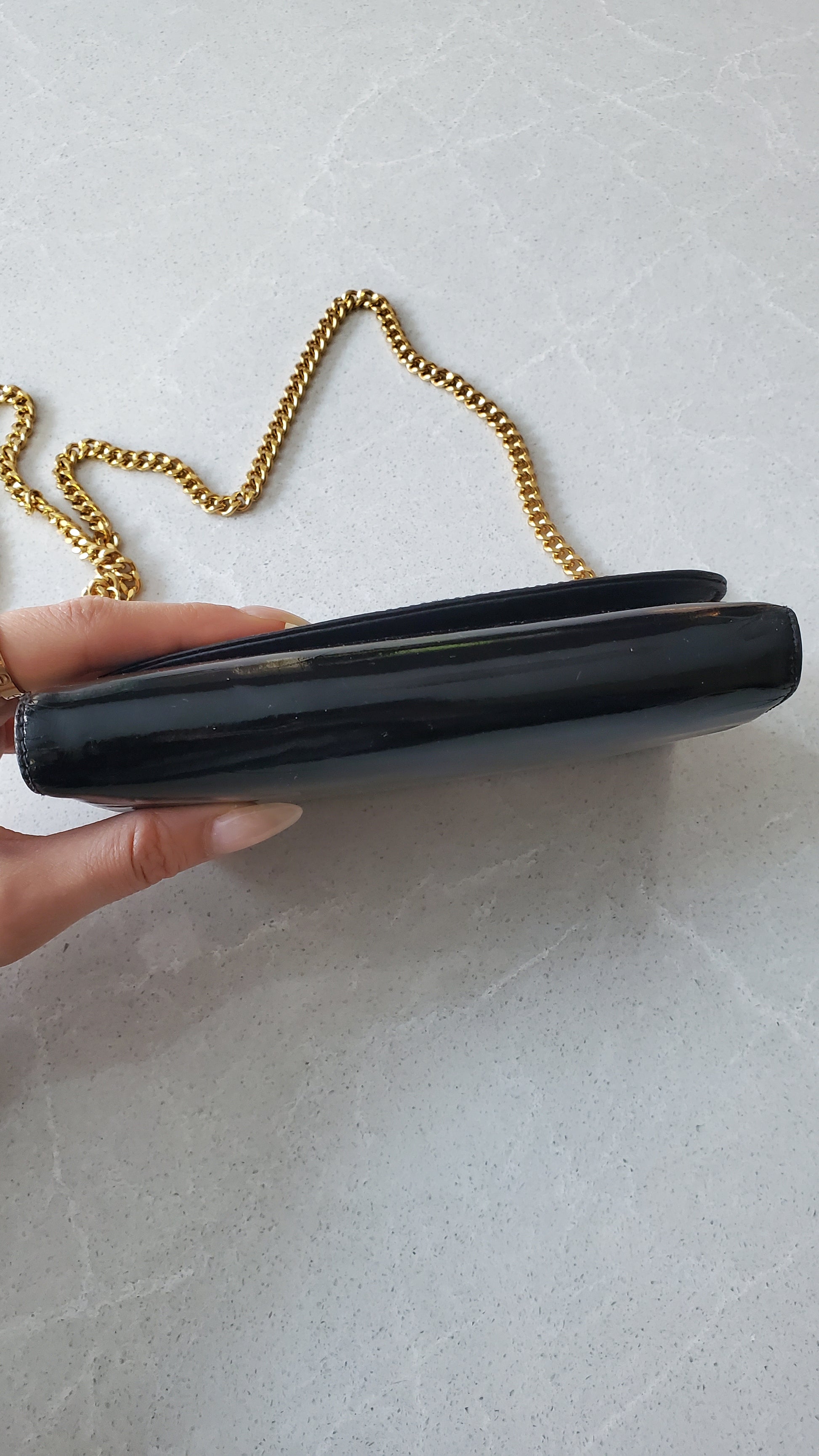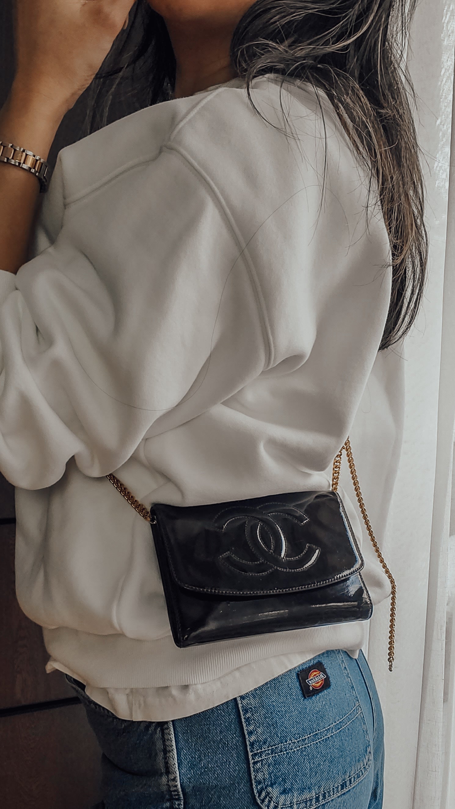 Authentic vintage Chanel black patent compact wallet reworked into a timeless and practical wallet on chain that can be worn crossbody, shoulder, handle, or around the waist! See photos for styling ideas