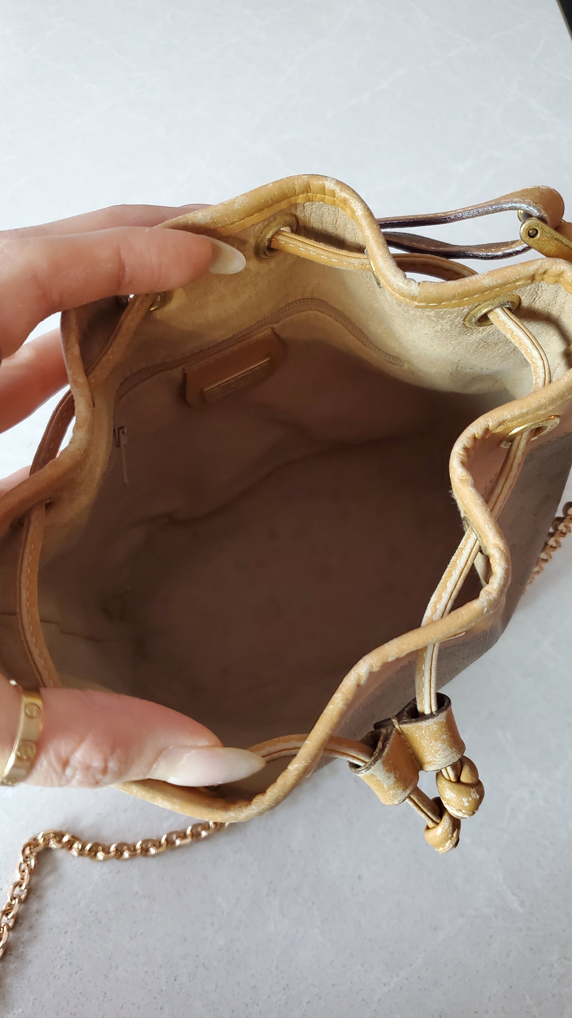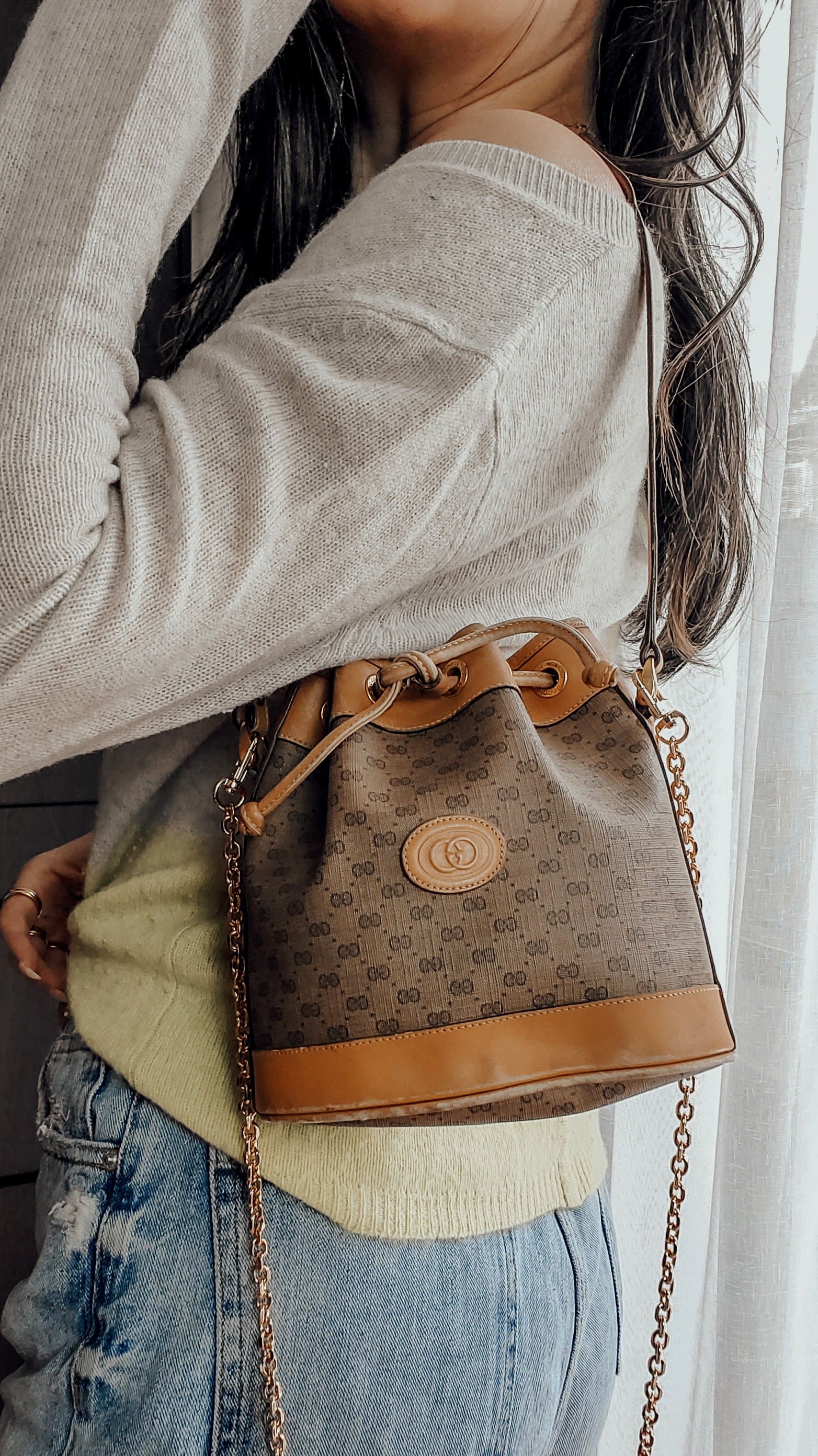 Authentic Vintage Gucci Small Tan Bucket Bag with Chain