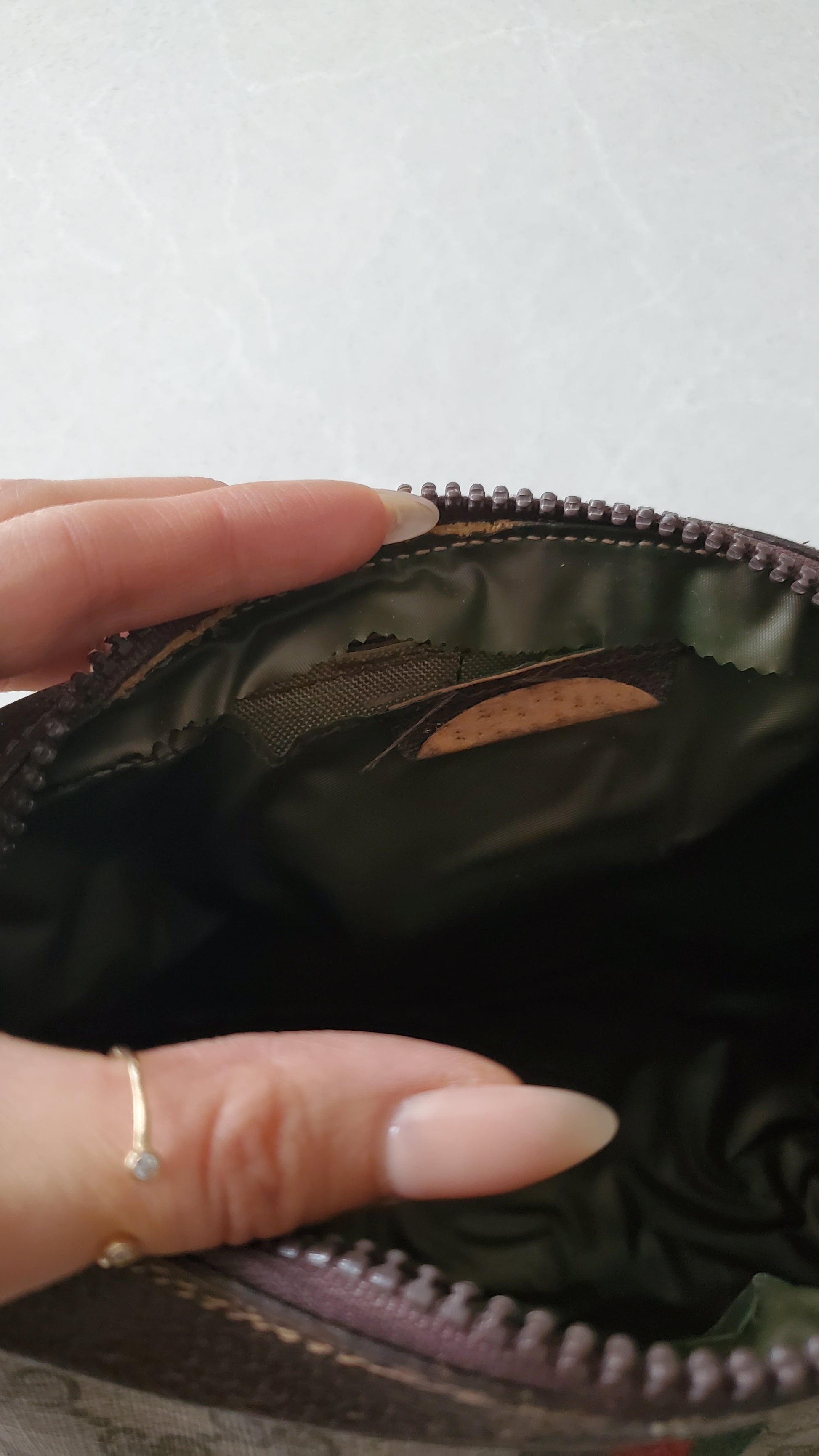 Outer canvas is in great vintage condition overall. Inside's lining has some tear, but the bag can still be used as is. You can have it fixed, removed or replaced by your local shoe repair professional *see all photos for condition*