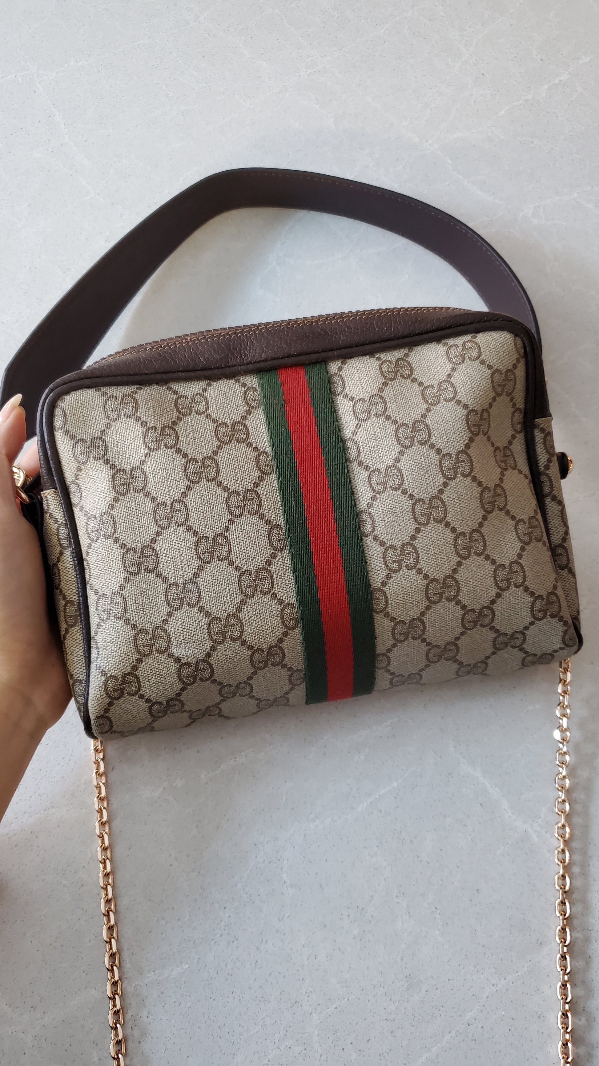 Authentic vintage Gucci purse reworked into a fun and versatile purse with chain and strap that can be worn crossbody, on the shoulder, or handle! See photos for styling ideas