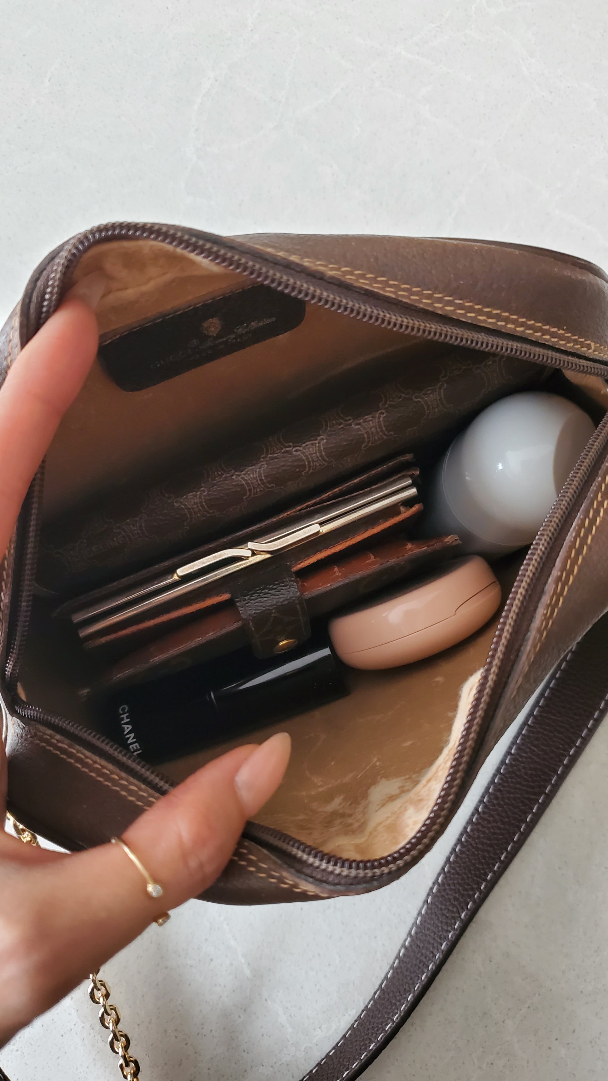 Beautiful, authentic vintage Celine tan purse reworked with a brand new modern strap and chain so you could wear this piece crossbody, on the shoulder, or handle! See photos for styling ideas
