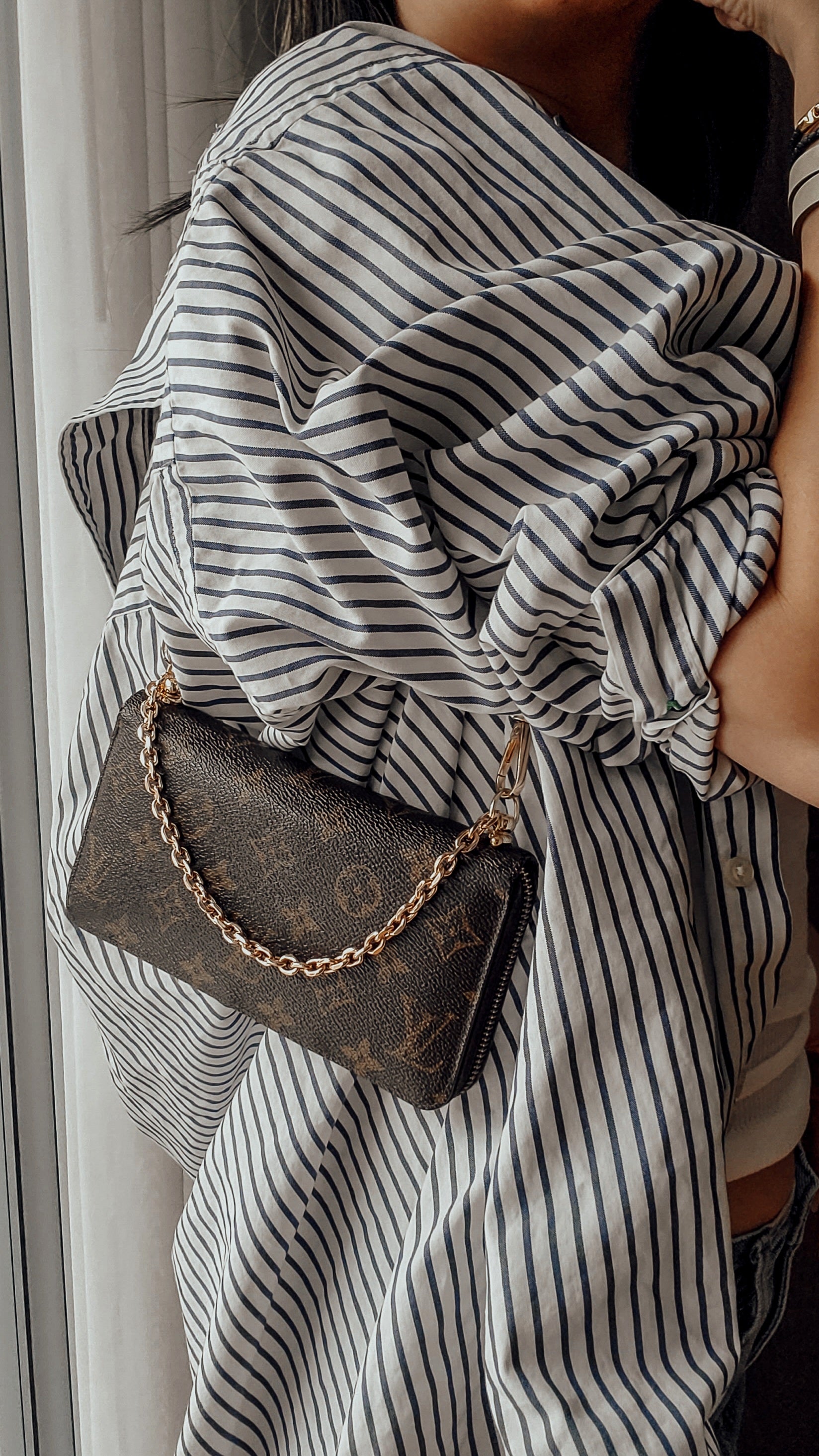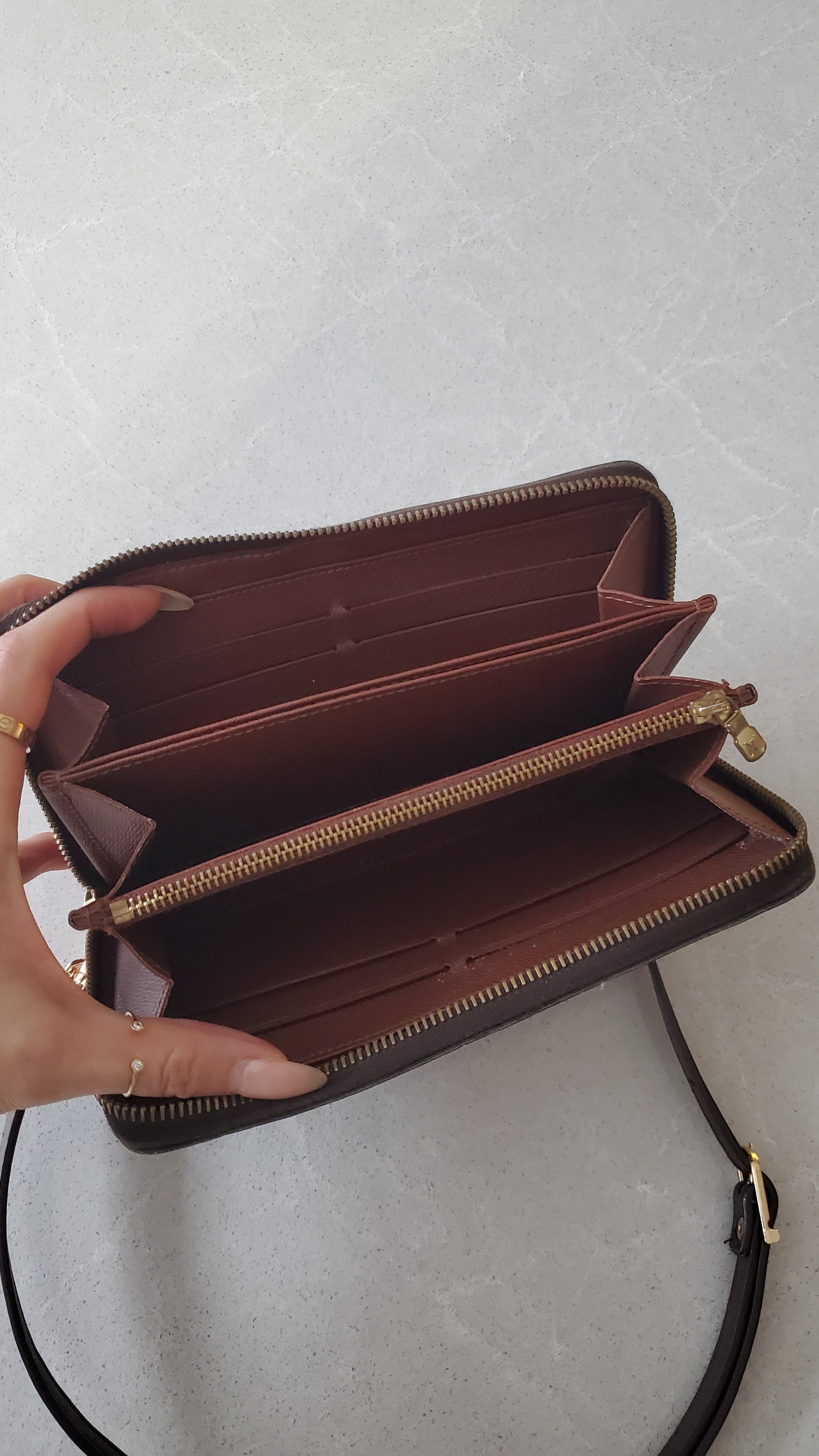 Authentic Louis Vuitton brown monogram long zip up wallet reworked into a practical and versatile wallet on strap and chain that can be worn on the shoulder, or handle! See photos for styling ideas