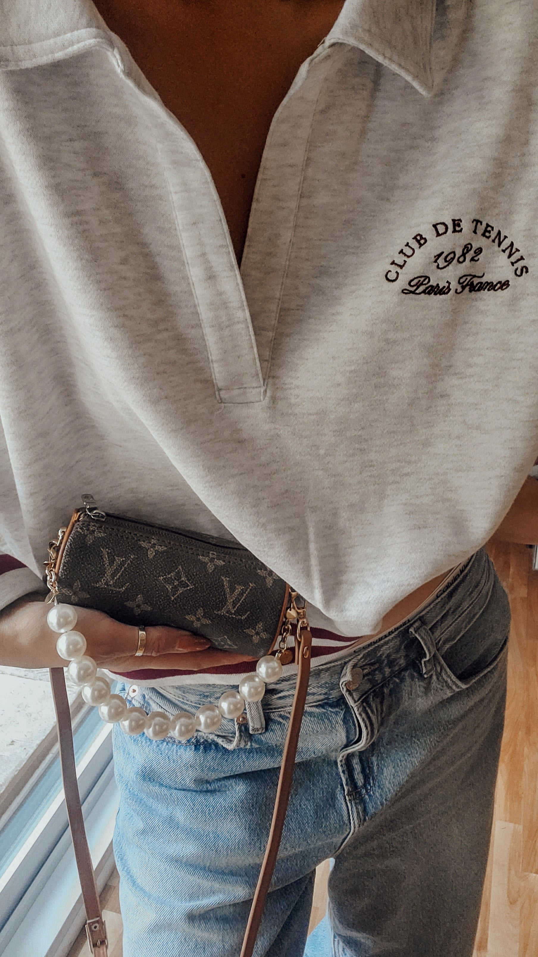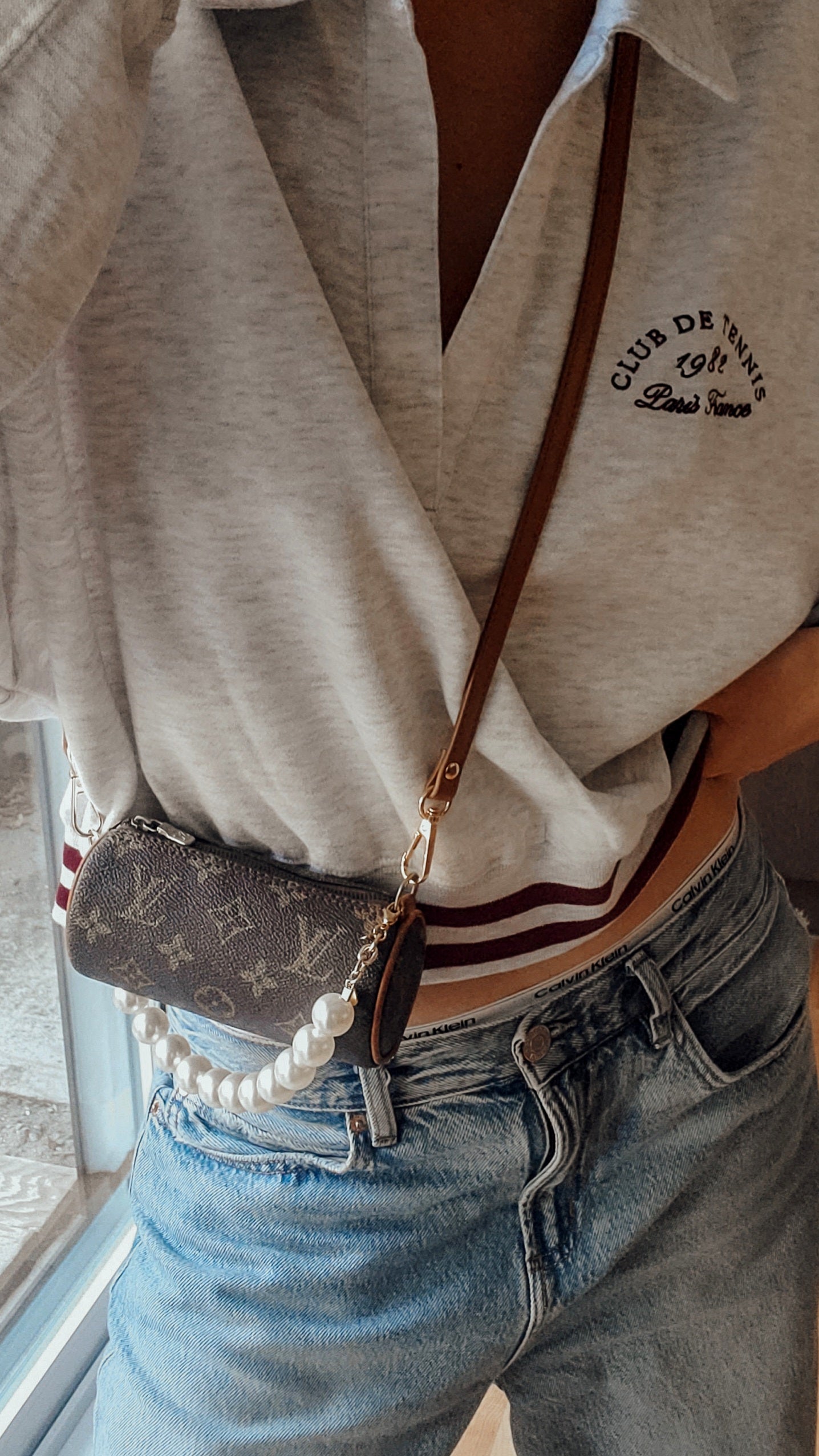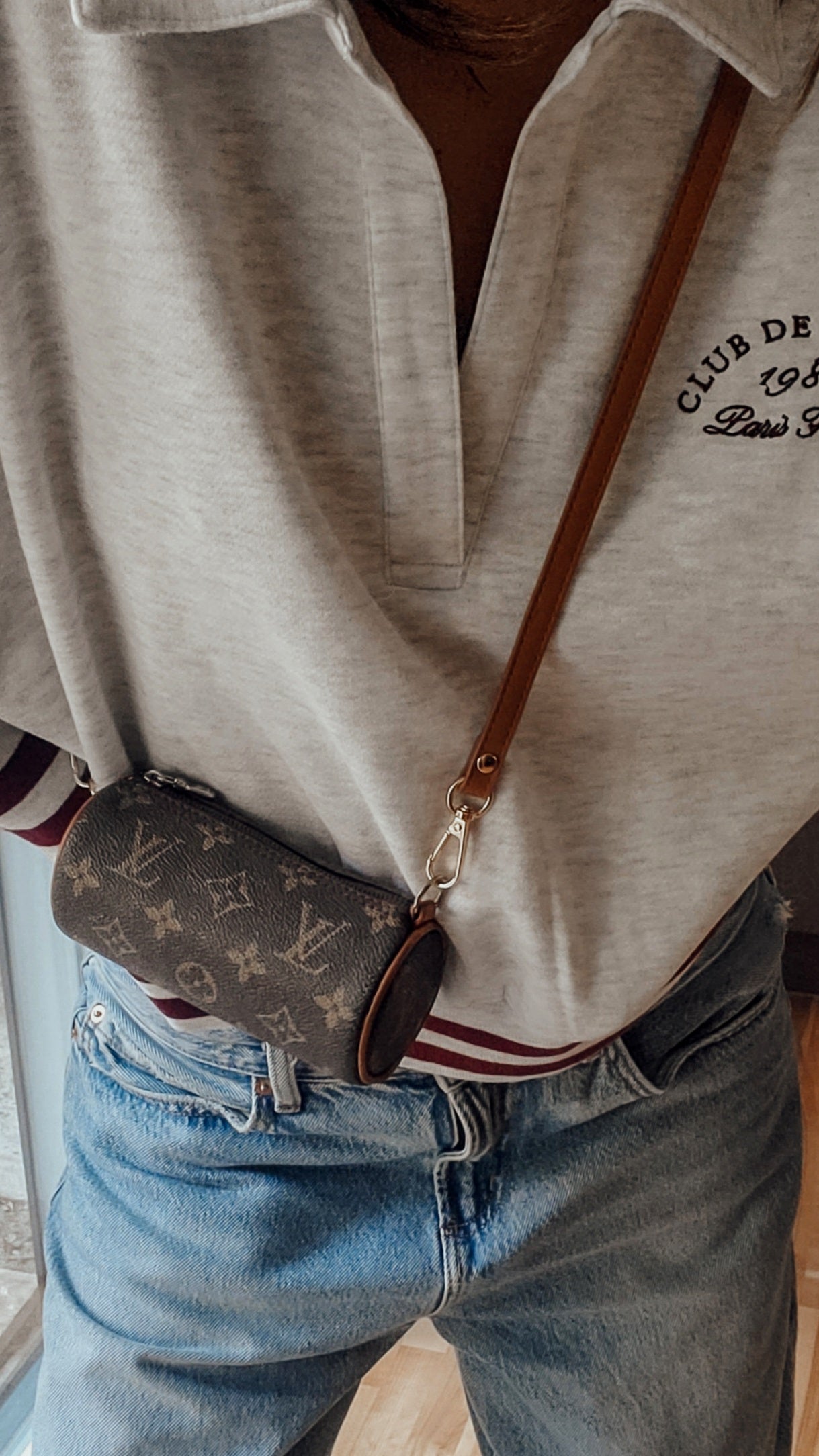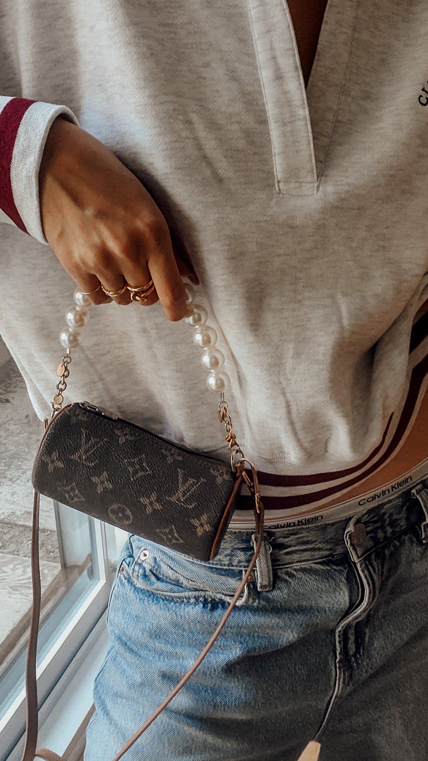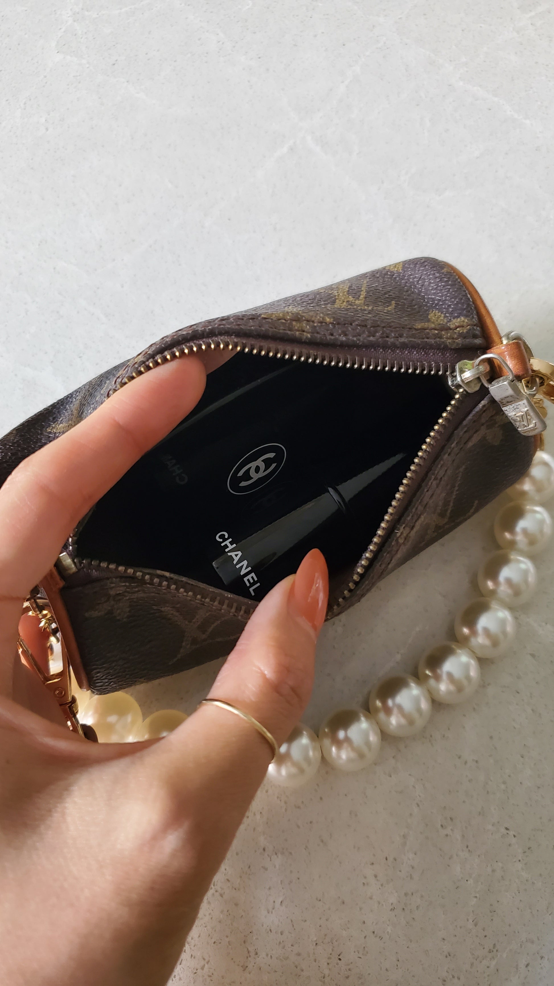 Authentic Louis Vuitton brown monogram pouch reworked into a practical and versatile pouch on strap and chain that can be worn crossbody, shoulder, or handle! See photos for styling ideas