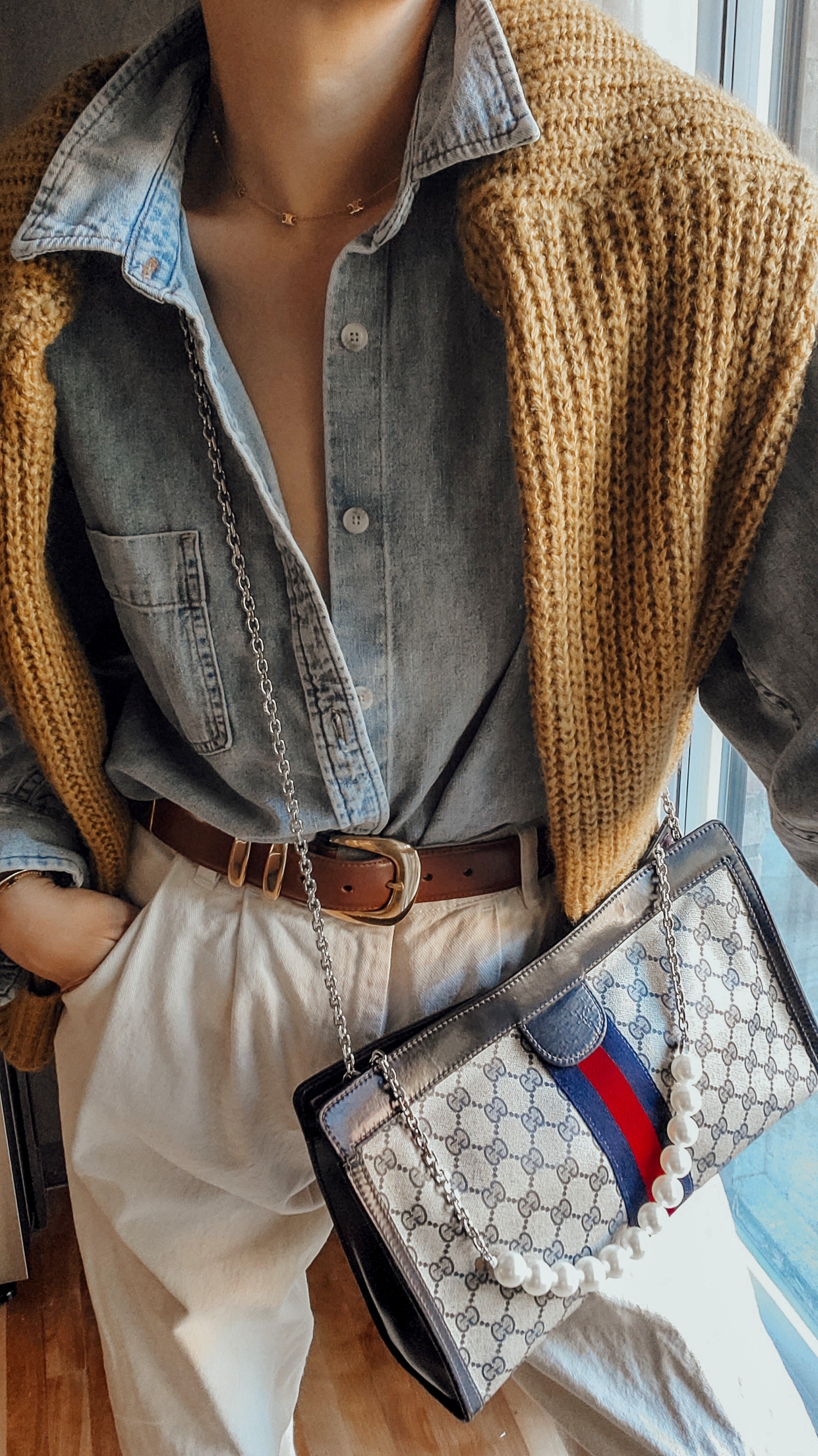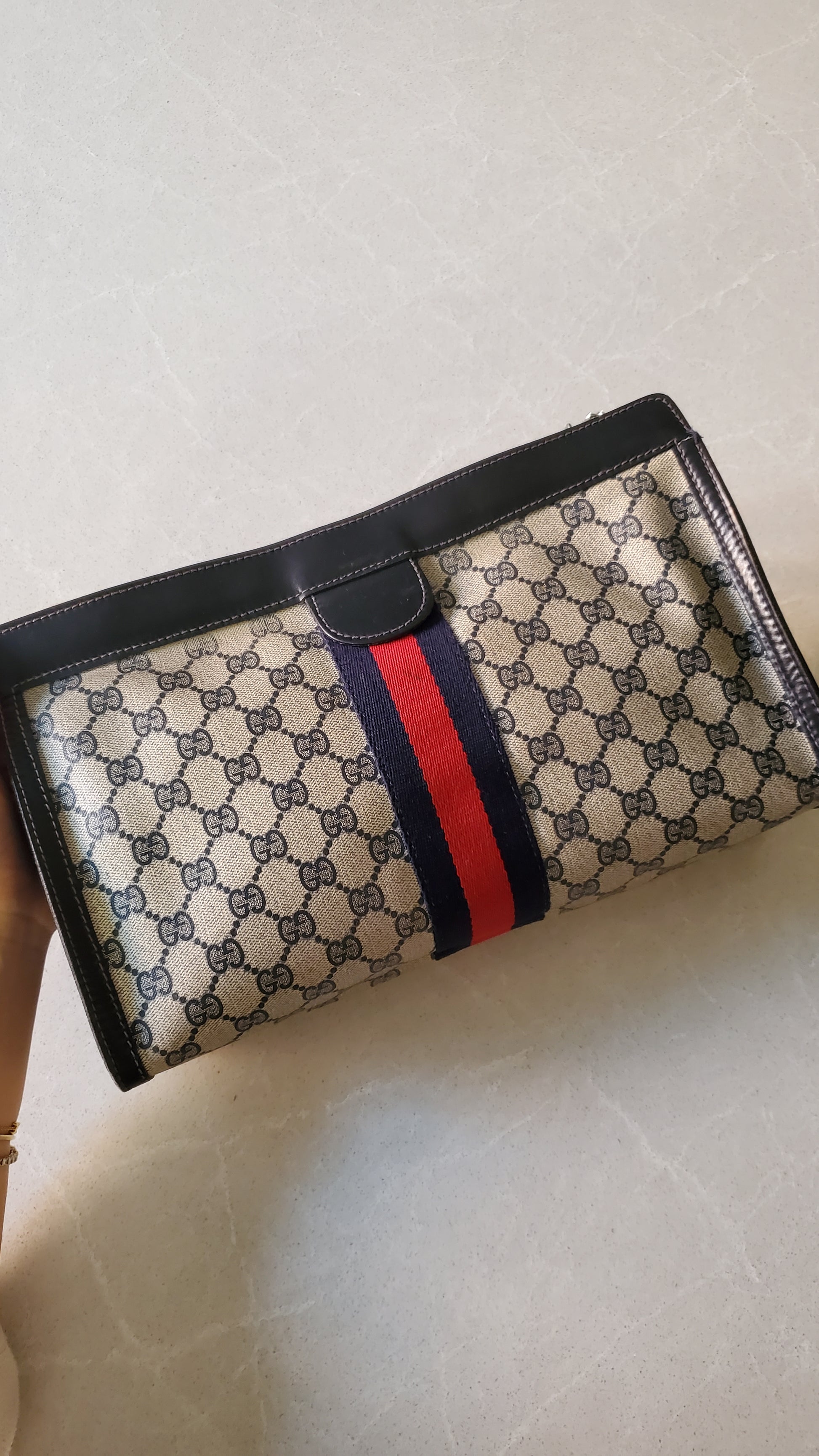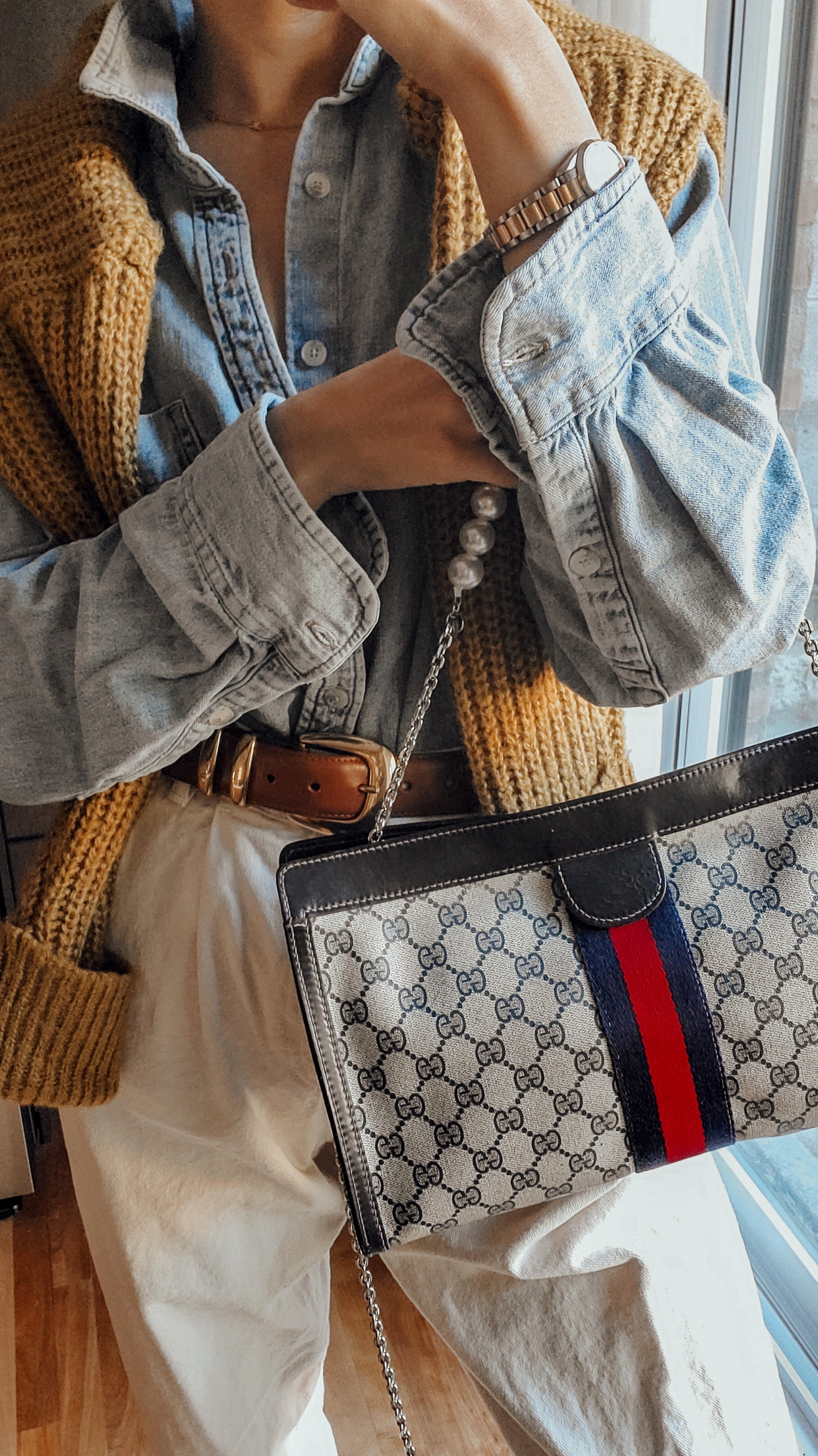 Authentic vintage Gucci large bag (with velcro closing) upcycled with a brand new handmade chain, so it can be worn crossbody, on the shoulder, or handle. See all photos for styling ideas