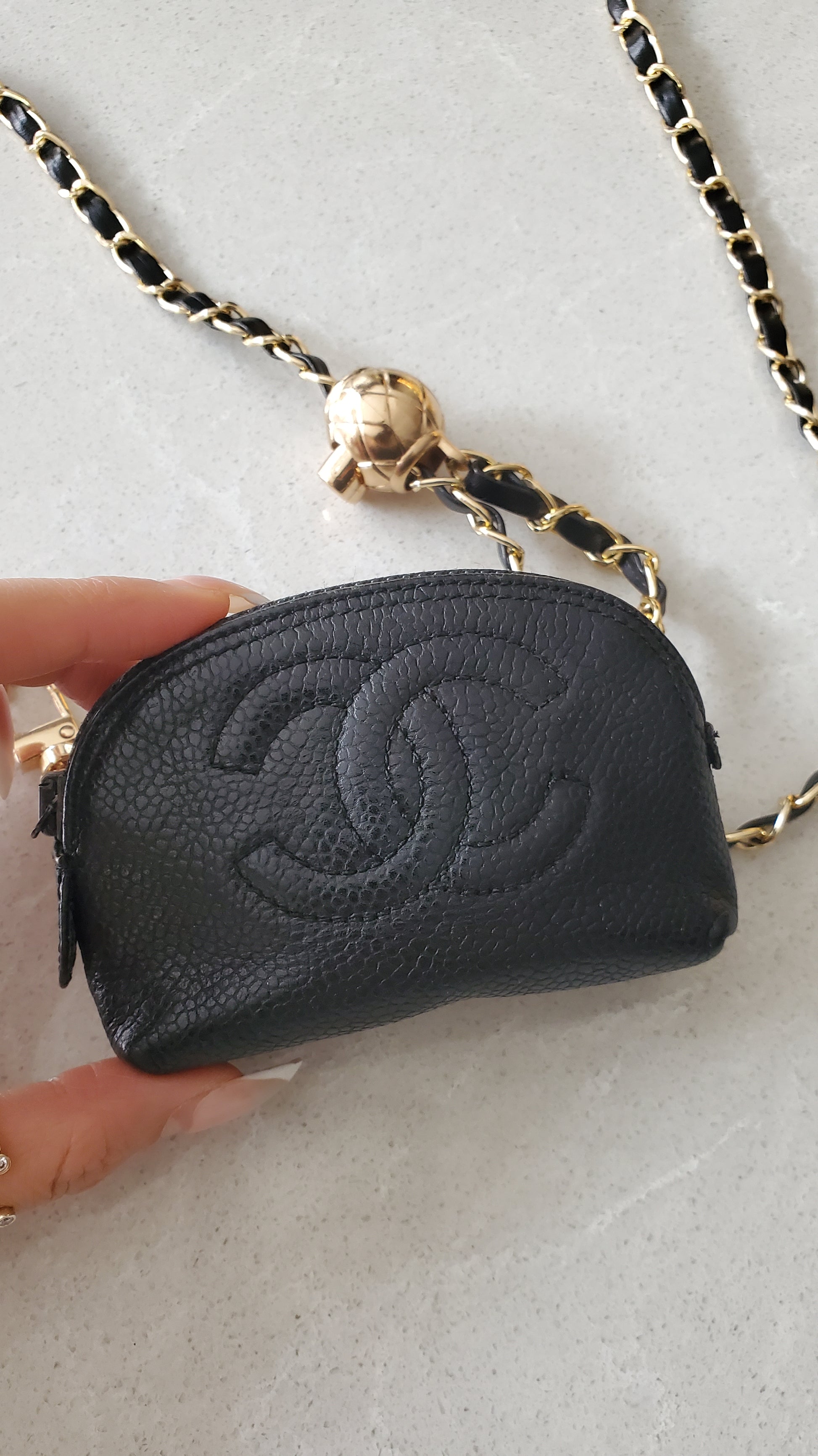 Beautiful authentic vintage Chanel black caviar leather small pouch reworked into a timeless and practical pouch on chain that can be worn crossbody, or around the waist! See photos for styling ideas
